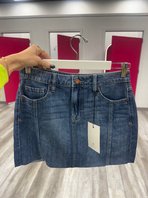 Loading image: Person wearing a light blue denim skirt on a neutral background