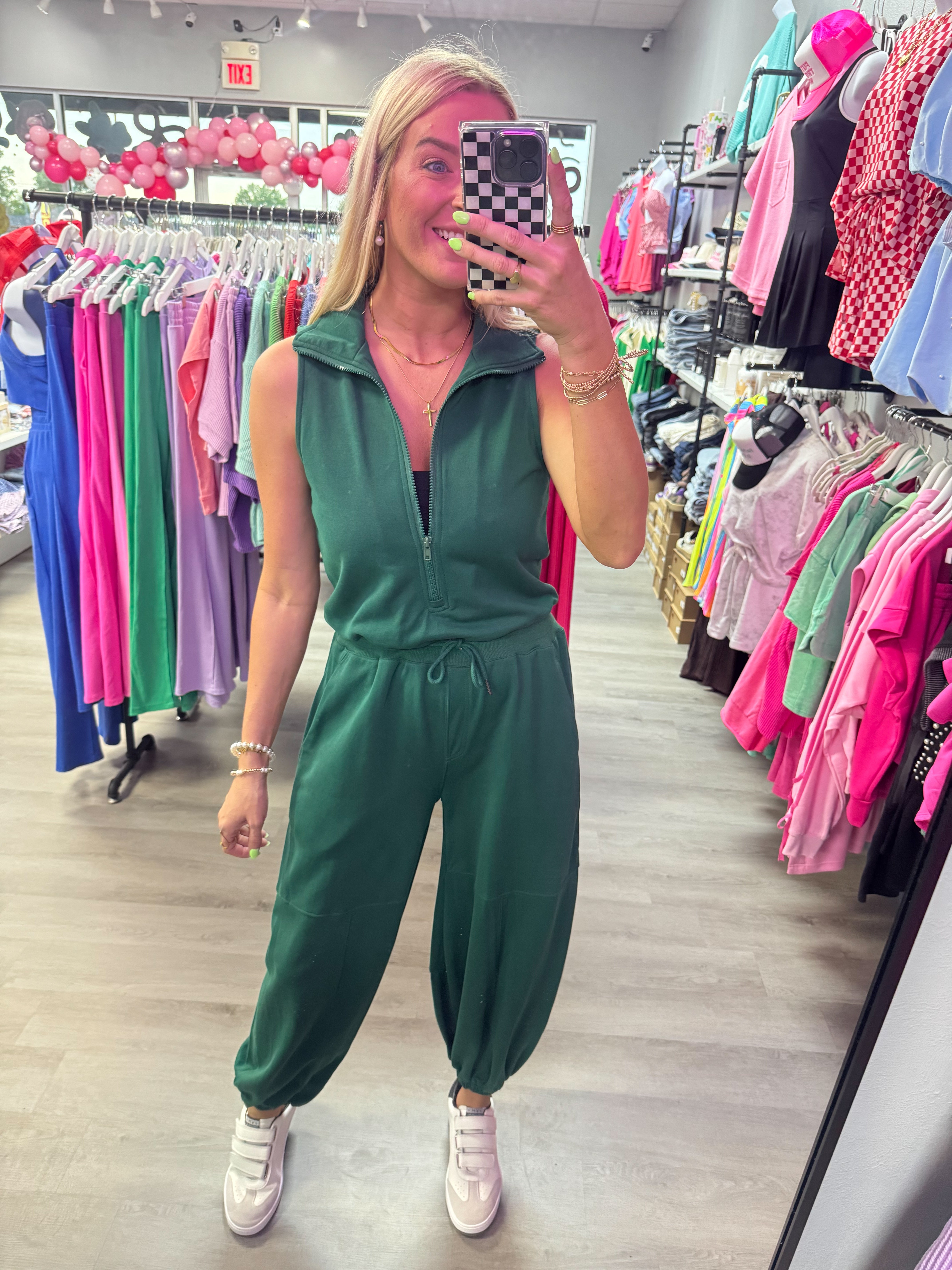Effortlessly stylish and comfortable, our Hunter Green Zip Jumpsuit is perfect for any occasion. Featuring a solid color and playful jogger style, this sleeveless jumpsuit is accented with a self tie at the waist for a flattering fit. The elastic ankle and pockets add convenience and functionality. Lightweight and non-sheer, this jumpsuit is a must-have addition to your wardrobe.