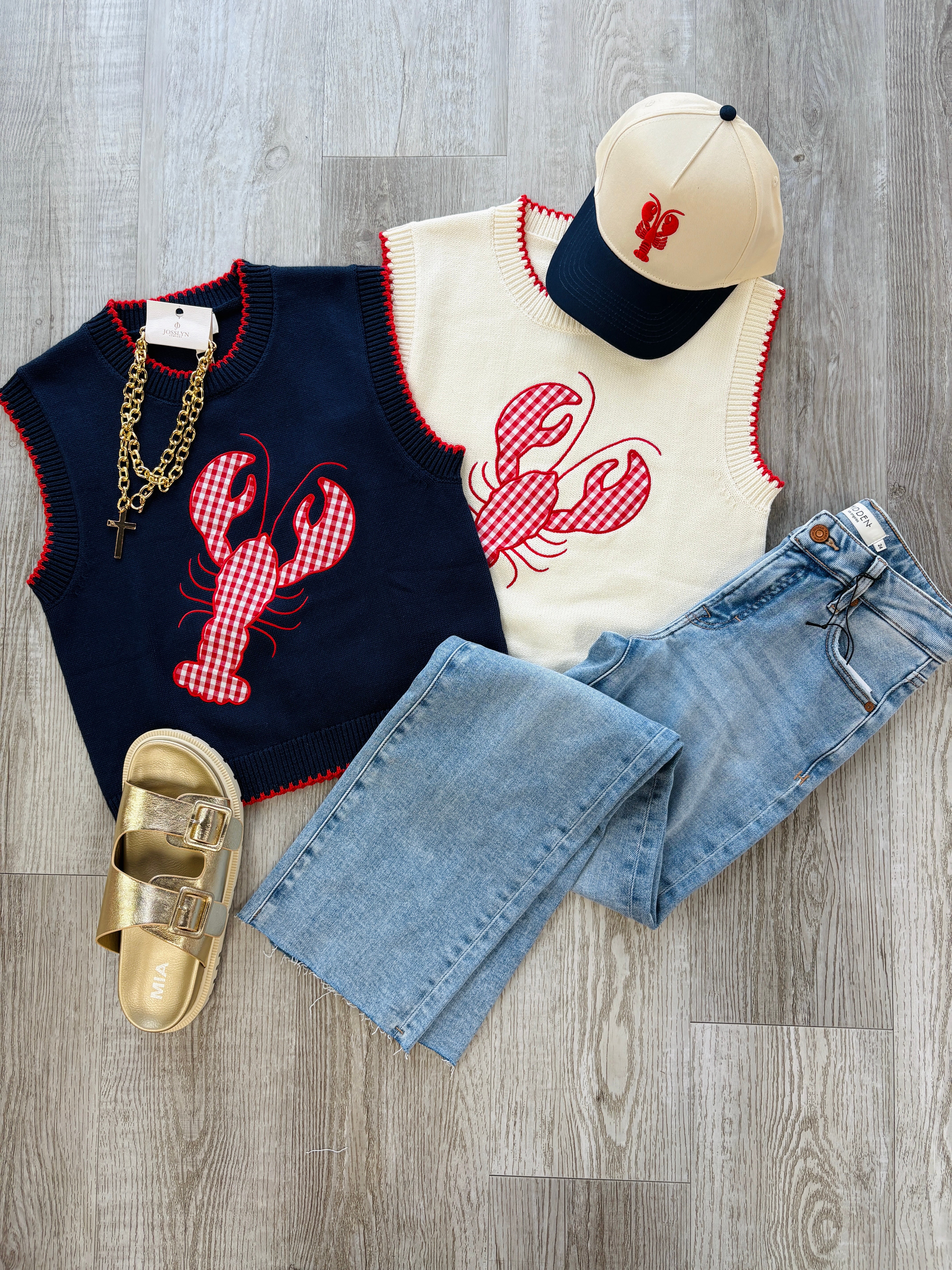This sweater vest features the cutest red gingham crawfish graphic that instantly gives Mardi Gras, crawfish boil, and spring in Louisiana vibes all in one. She’s playful but still polished — easy to dress up with white denim or keep casual with your favorite everyday jeans.