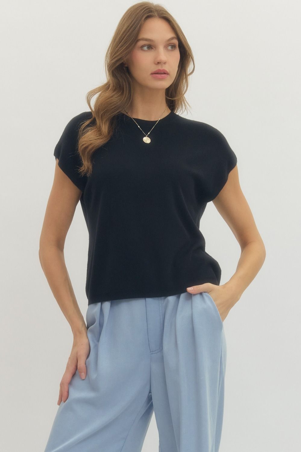 Meet your new go-to knit top you’ll reach for on repeat! This lightweight sweater-style top features a clean, minimal look with a flattering relaxed fit and cap sleeves that give it that effortlessly elevated vibe. The soft knit fabric drapes beautifully without clinging, making it perfect for work, weekend, or dressing up with statement jewelry.