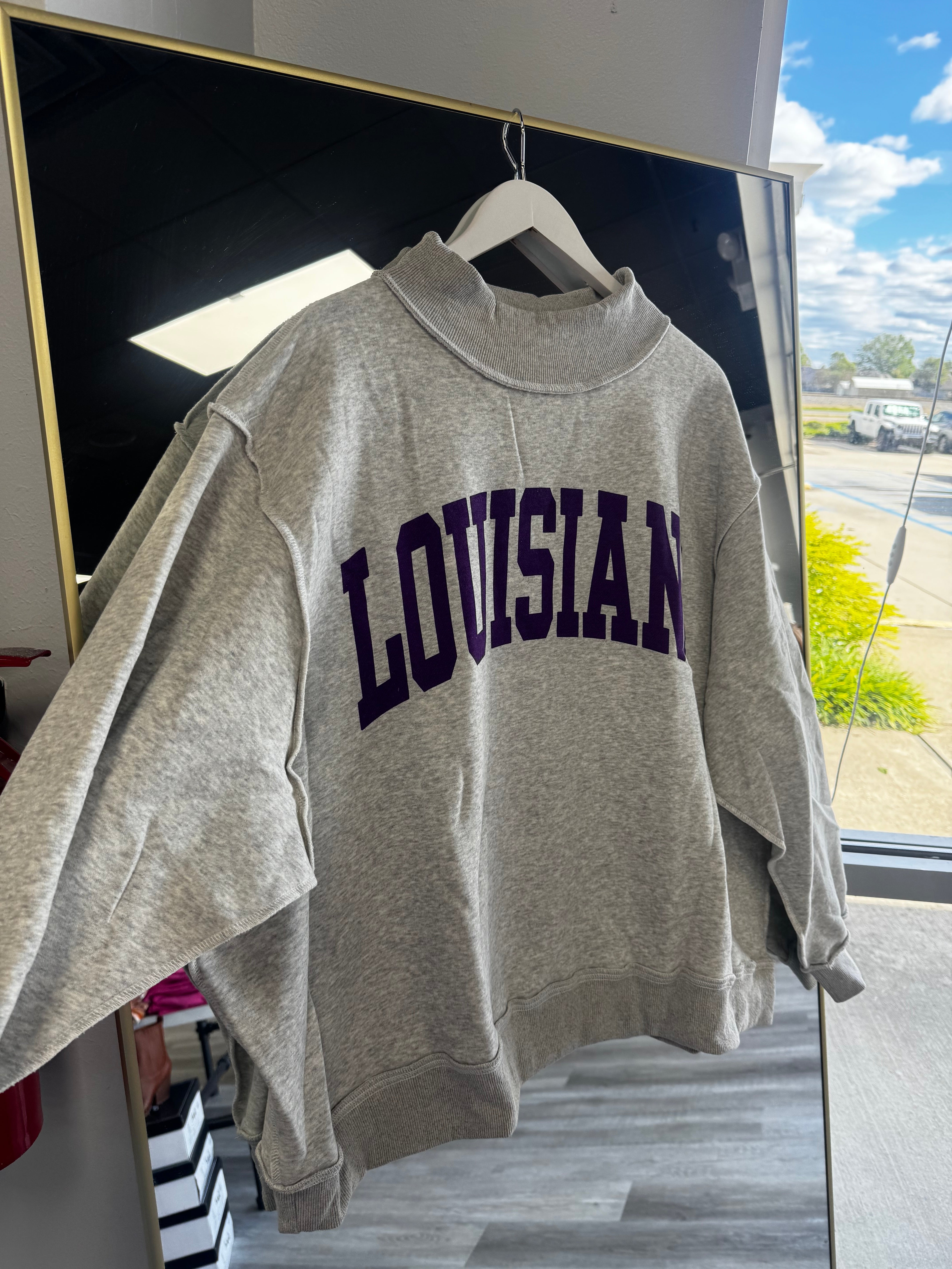 'LOUISIANA & TIGERS' Print Reversible Mock-neck Sweatshirt - Mock-neck - Drop shoulder, long sleeves - Softest cozy fleece - Oversized fit - Rib banded hemline and cuffs - The reversible design lets you switch up your style.