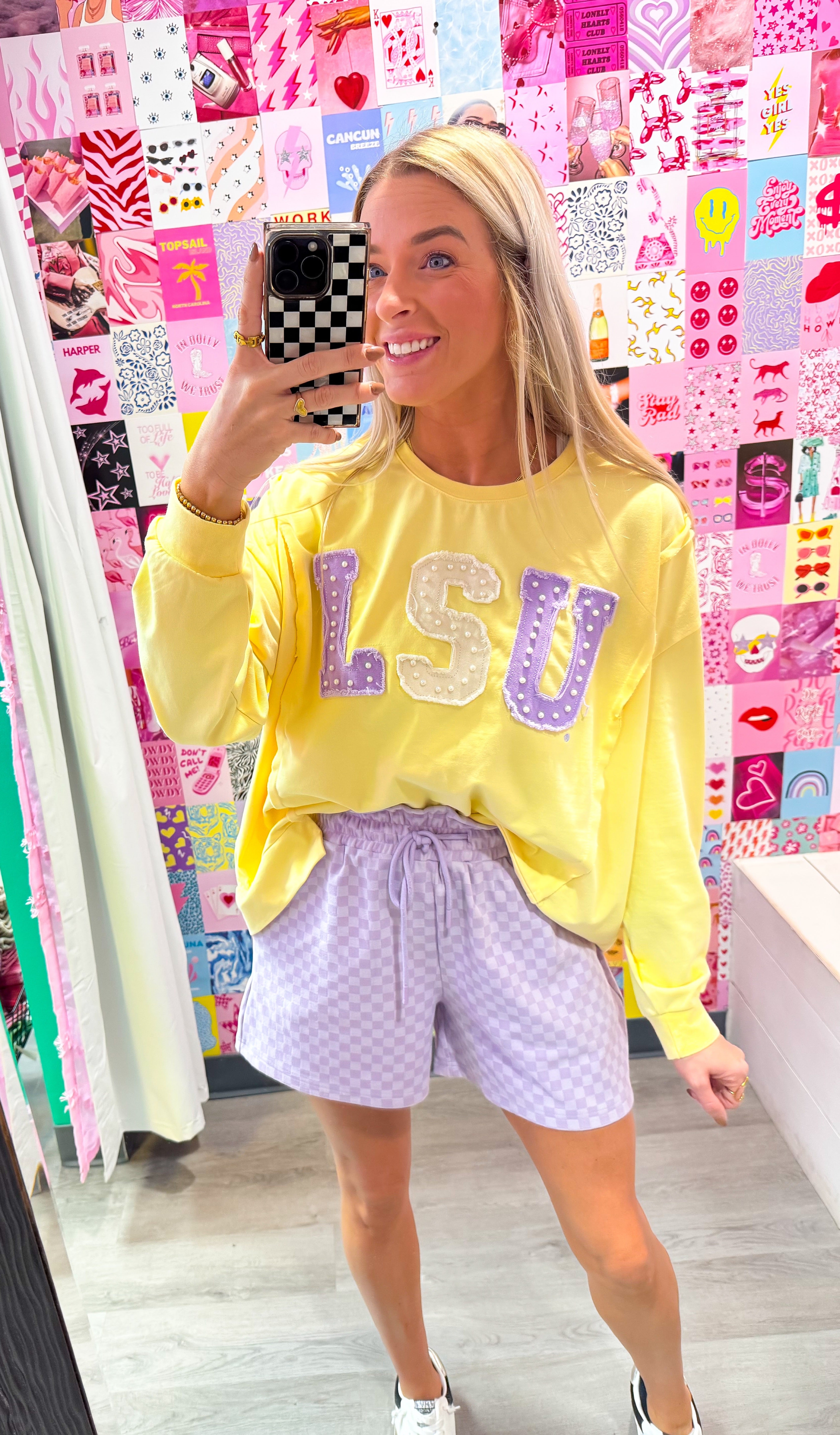*OFFICIALLY LICENSED BY LSU* The indicia featured on this product are trademarks of Louisiana State University. LSU (Licensed) | Women's Distressed Embroidery Pullover (Butter Yellow) Callin' all LSU Fans! Stay comfy and cute in our distressed embroidery pullover, featuring beautiful pearl embellishments and alternating lavender and off-white lettering. Material: 100% Cotton Features: Distressed Embroidery & Pearl Embellishments!
