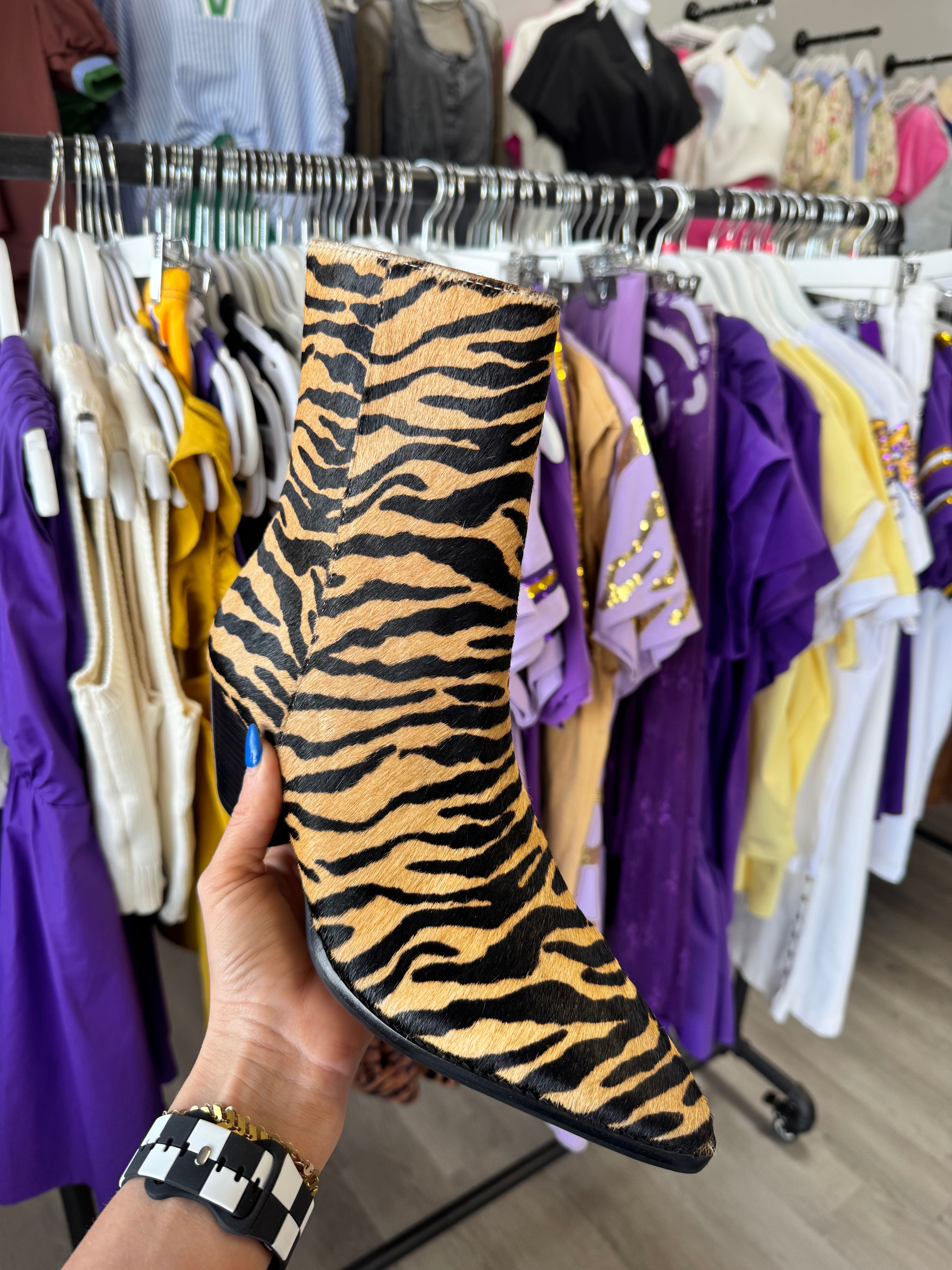 These Tiger Boots by Matisse combine classic western inspiration with a contemporary edge. Crafted with a leather upper and textile lining, they offer durability and comfort. The padded insole ensures all-day wearability, while the zipper closure provides easy on and off. Featuring a pointed toe and bold tiger print, these ankle boots make a confident statement for any modern wardrobe.