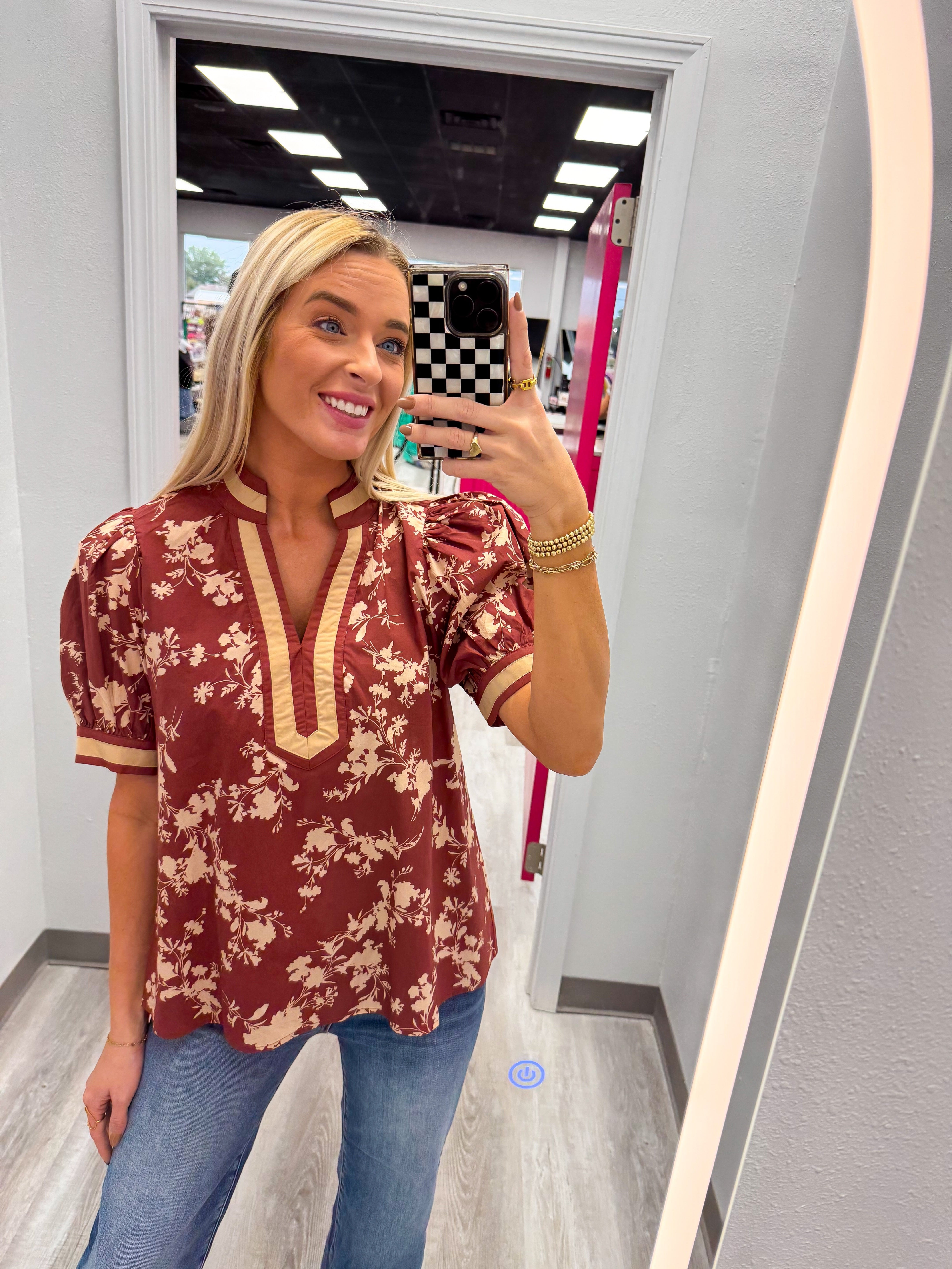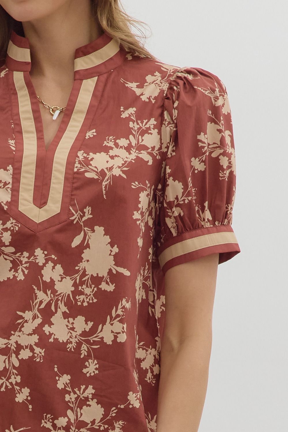 This lightweight, woven top features a charming floral print and short puff sleeves for a feminine touch. The multicolor accent V-neck band collar adds a stylish, eye-catching detail, while its unlined, non-sheer fabric ensures comfortable wear without bulk. Perfect for warm days, the Breath of Fresh Air Top in terracotta brings effortless elegance to your wardrobe.