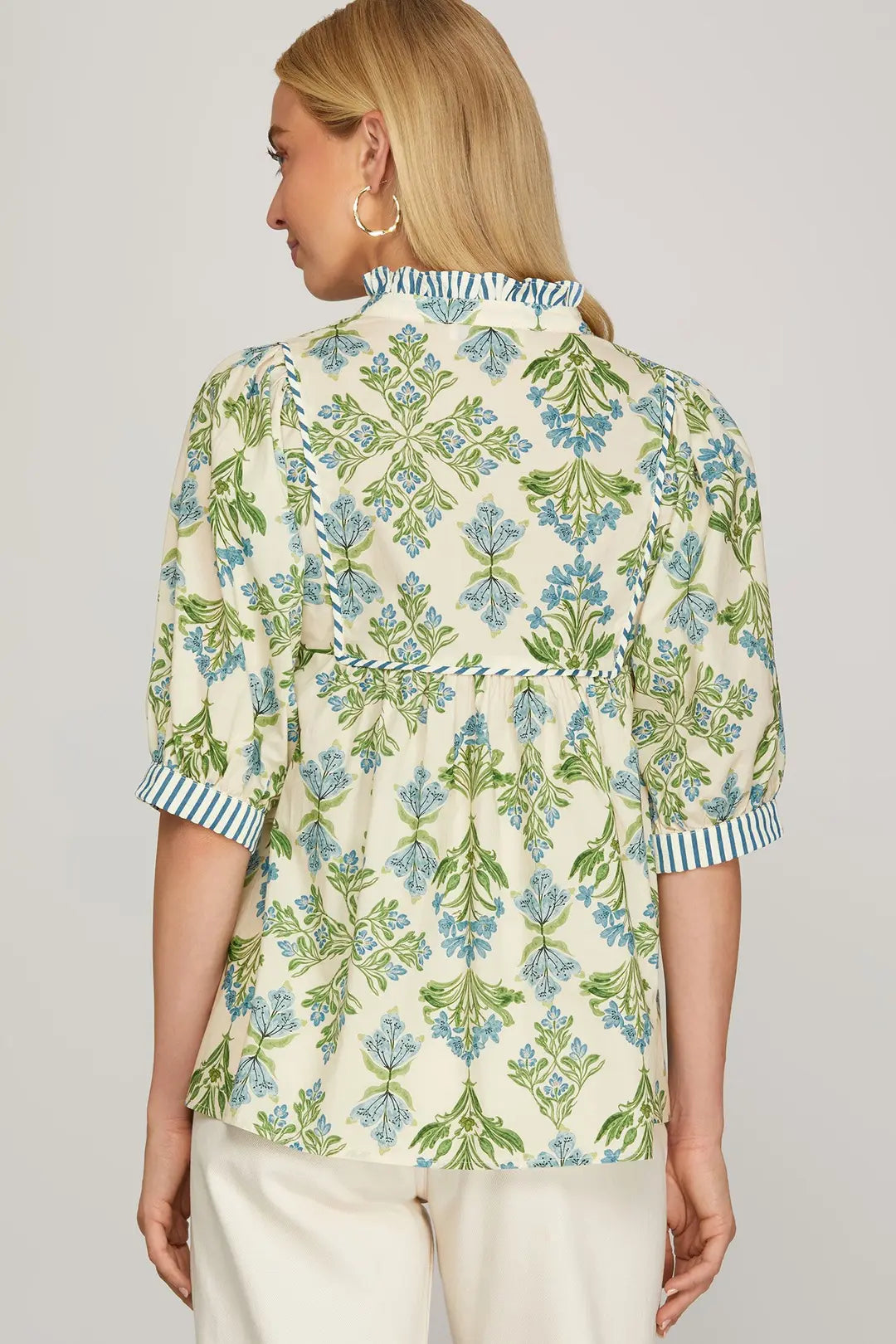 This top is one of those easy favorites you’ll keep reaching for. The soft floral print paired with the contrast stripe trim gives it that elevated boutique feel, while the relaxed silhouette keeps it comfy and flattering. It’s polished enough for work but effortless enough for everyday wear.