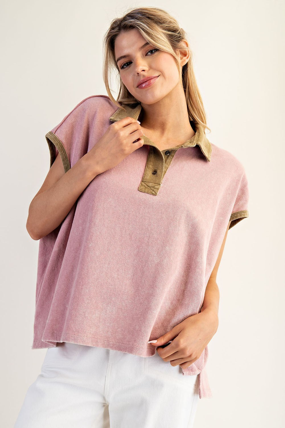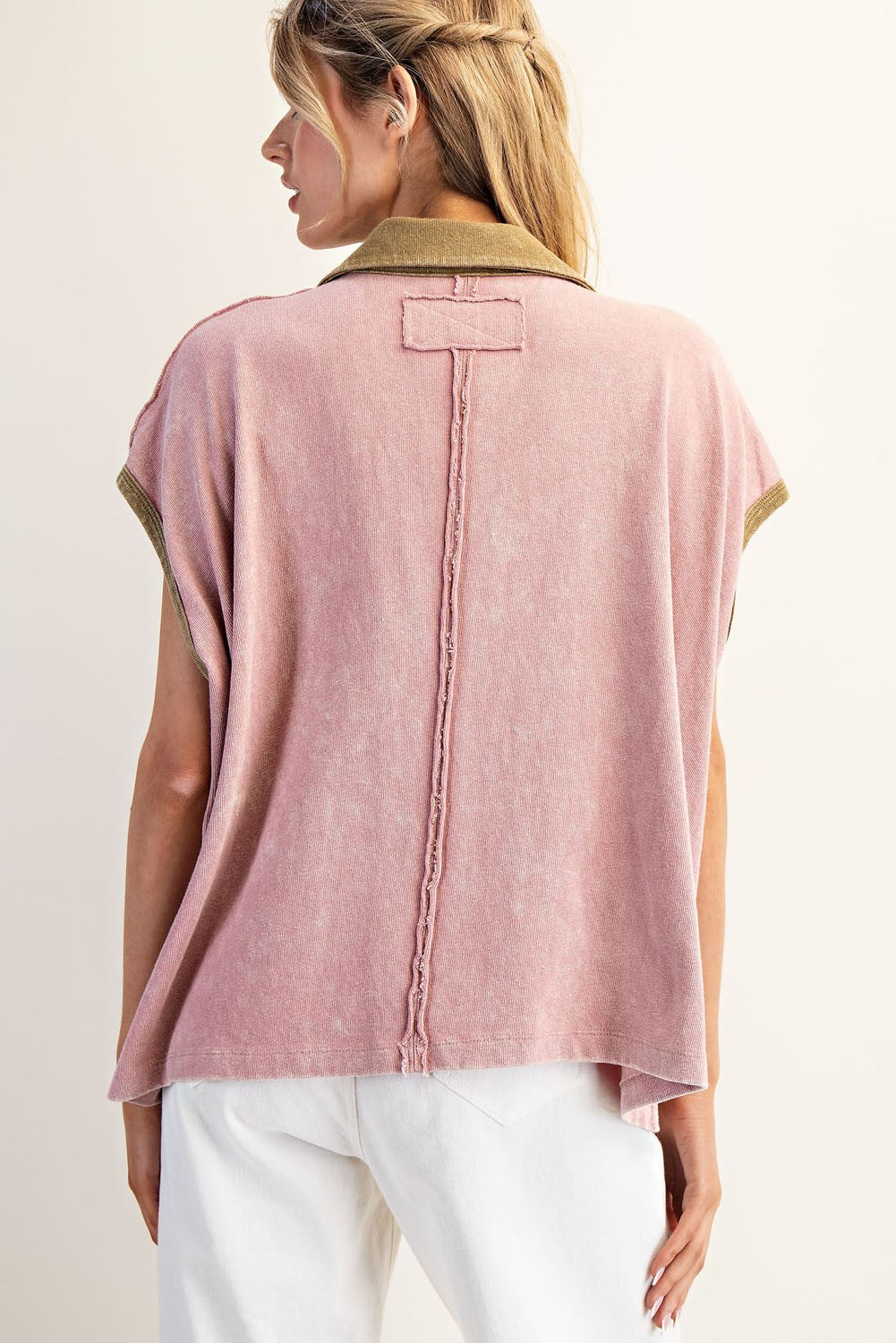 Product Detail: This sleeveless top features a contrast buttoned collar and sleeve cuffs, a patch detail with an exposed back seam, side slits, and a boxy silhouette with a softly washed finish.