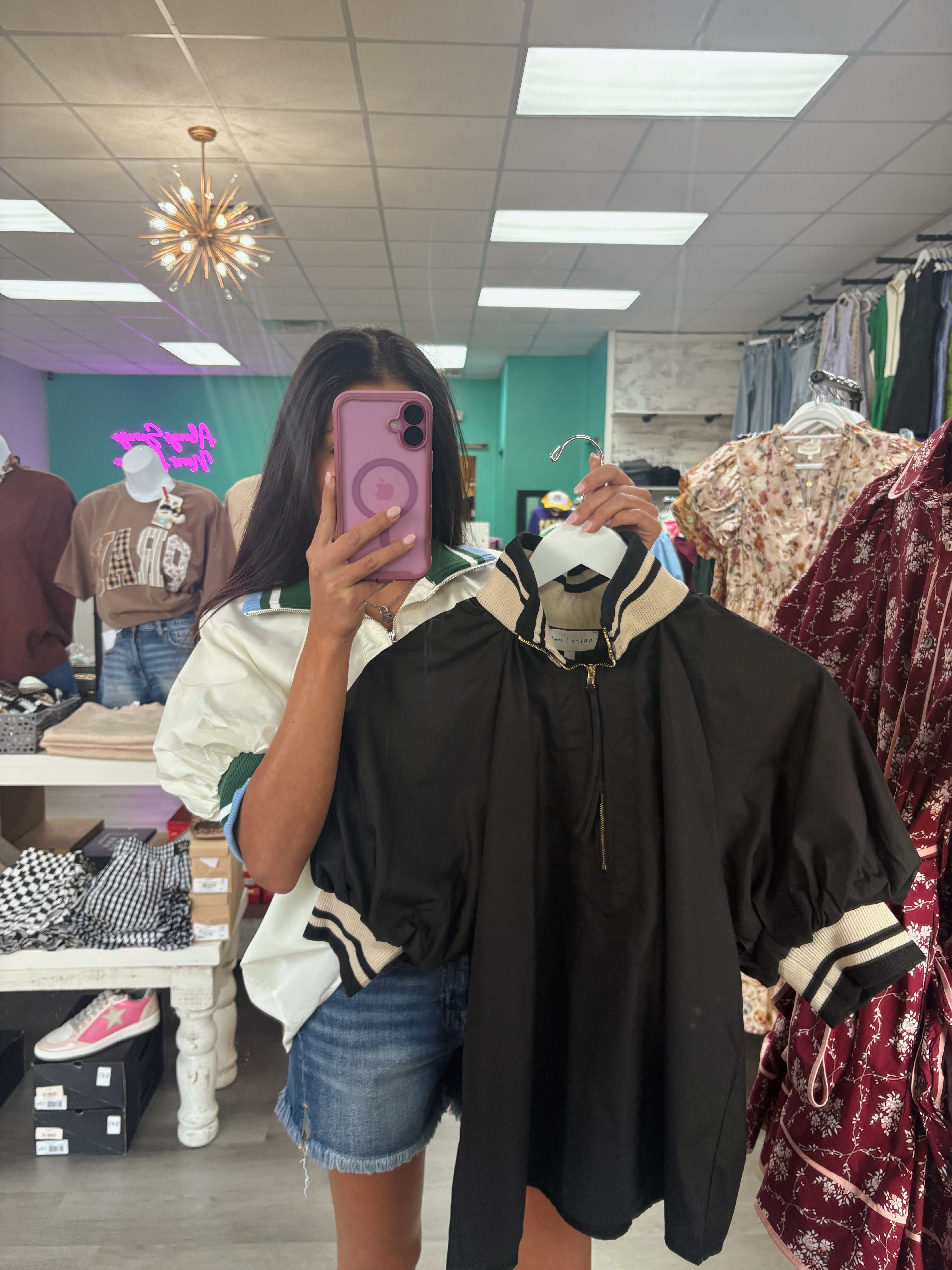 Solid zip-front closure elbow-length sleeve top featuring multicolor accent band. Unlined. Woven. Non-sheer. Lightweight.