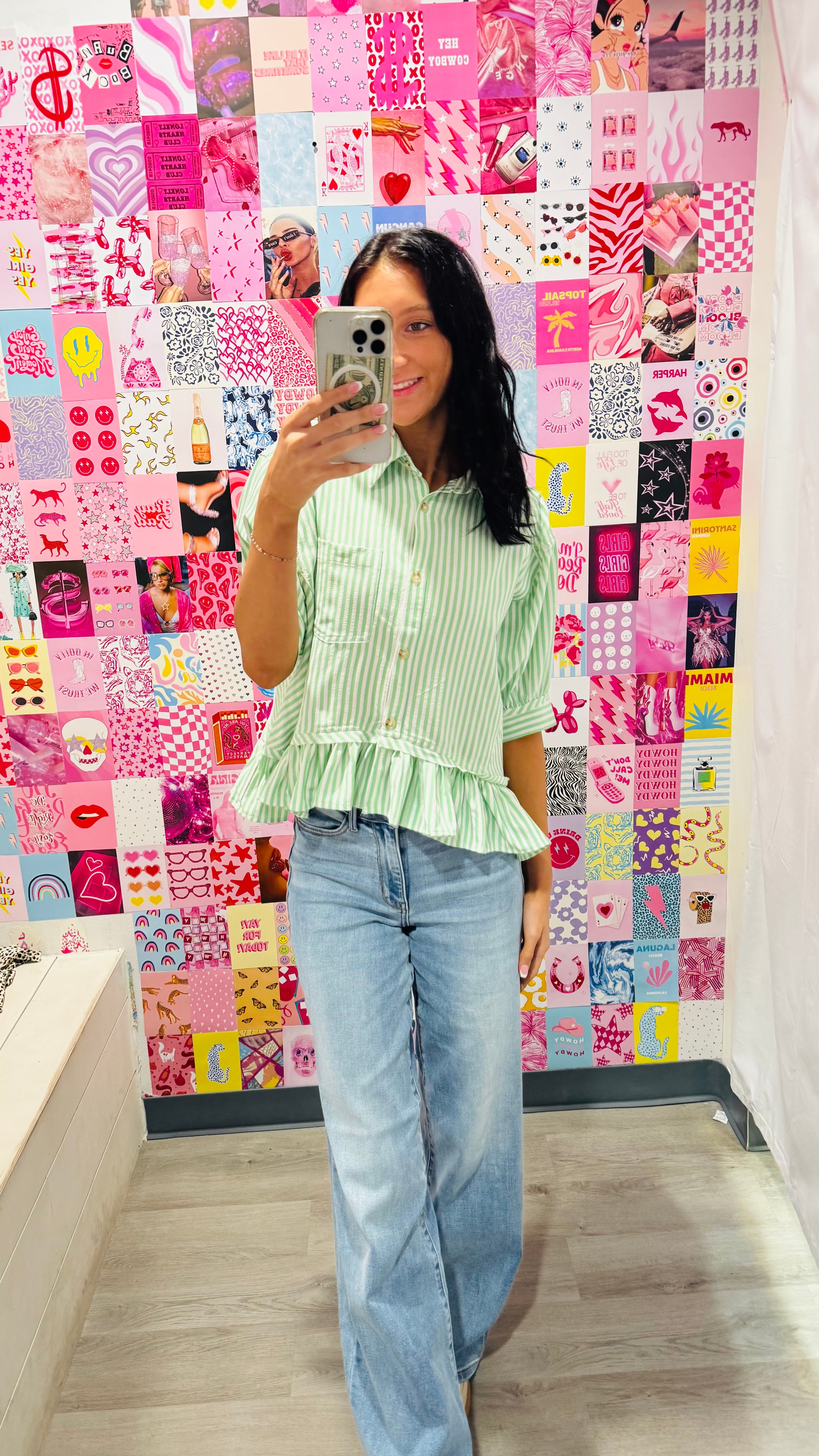 Stripe pattern cuff band ¾ sleeve ruffle hem button front closure top. Unlined. Woven. Non-sheer. Lightweight.