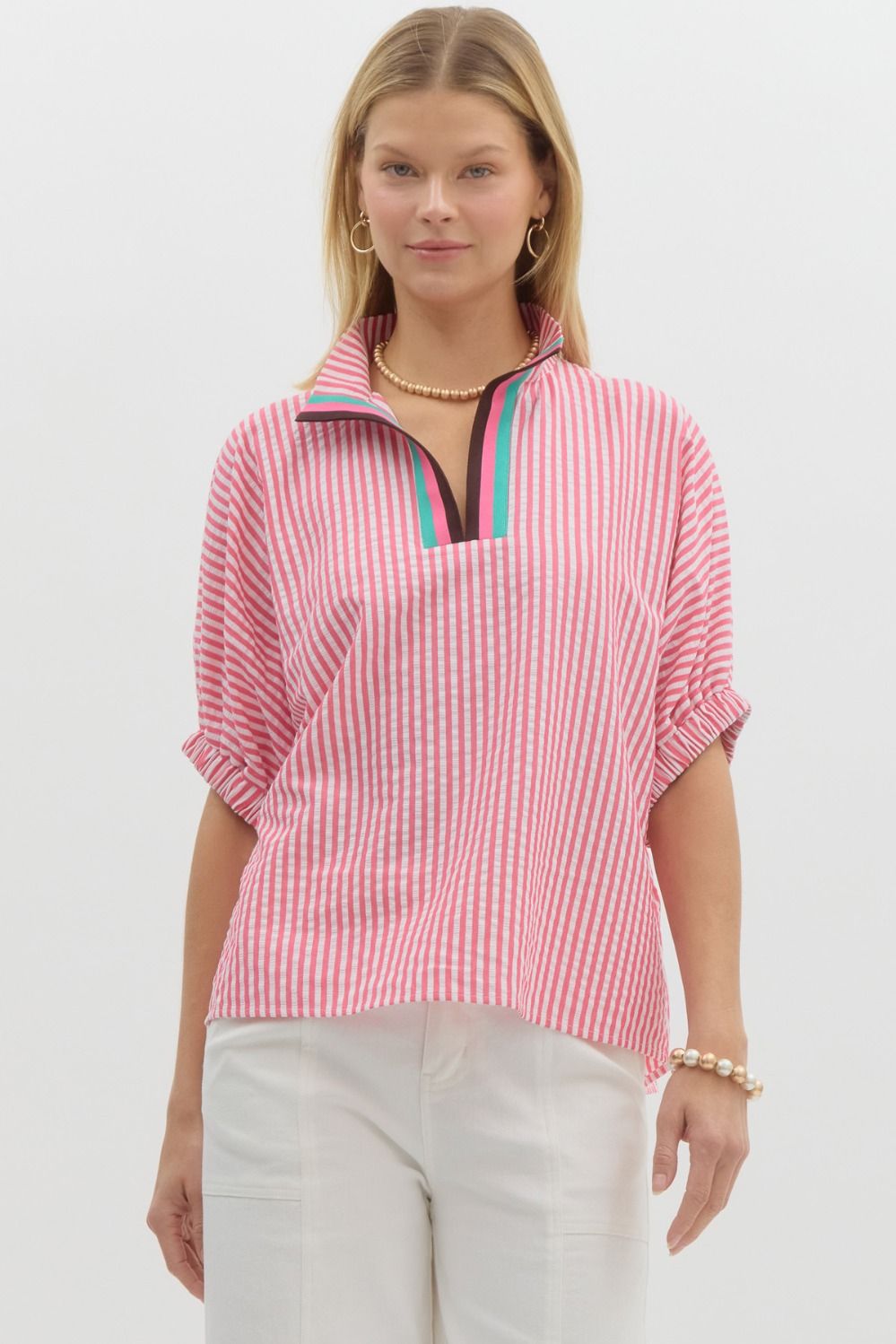 Get ready to make a statement in our In The Breeze Top! With a unique striped high neck design and elasticated sleeve band, this top stands out from the rest. The accented multicolor rib band and split neck add a pop of color, while the lightweight and non-sheer fabric keeps you comfortable all day.