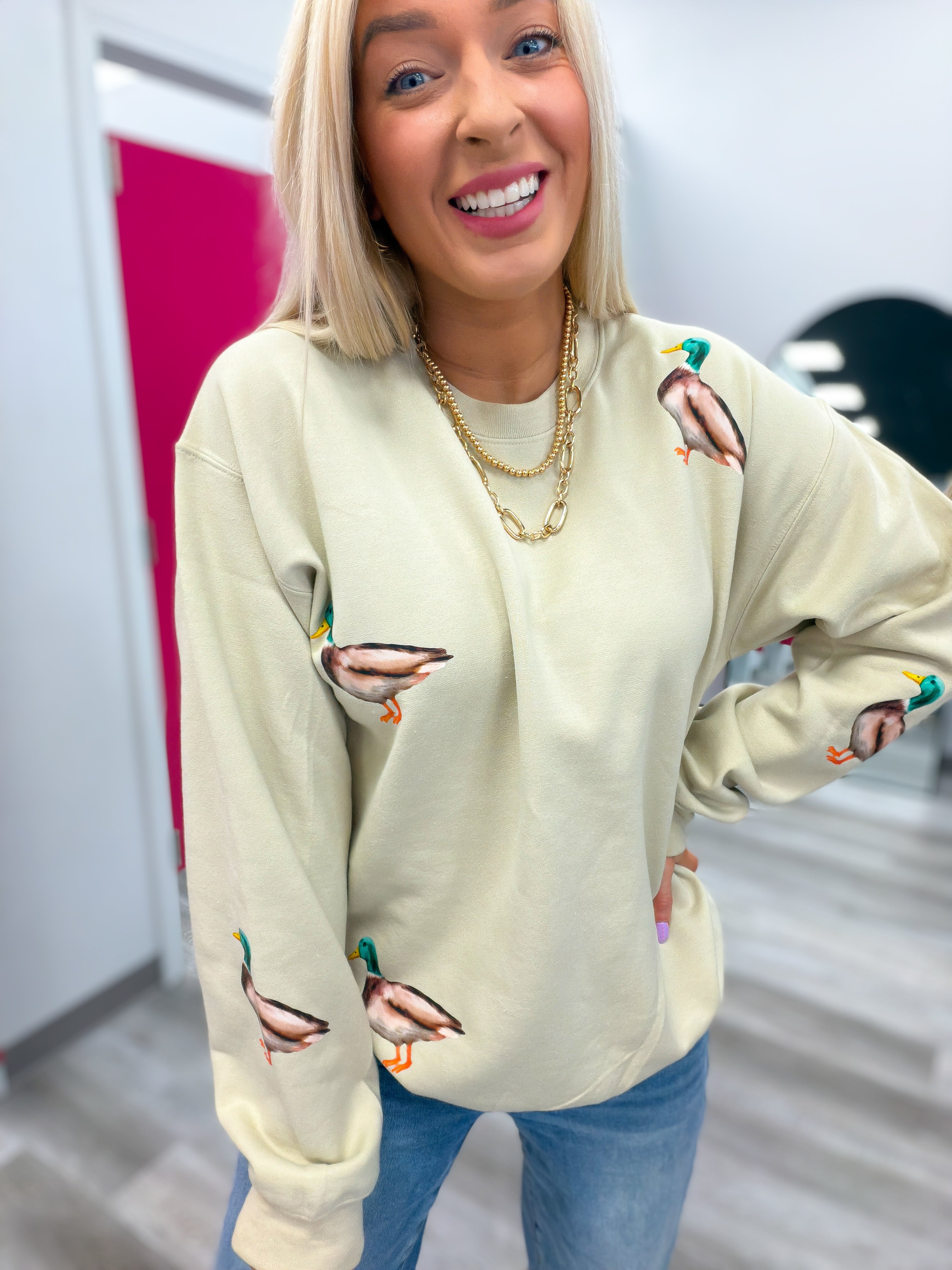 This sweatshirt is giving cozy + cute in the best way. Featuring an all-over duck print on a soft sand-colored base, it’s the perfect laid-back piece for running errands, lounging at home, or throwing on for a casual day out. The unisex fit makes it extra comfy and easy to style with leggings, denim, or your favorite joggers.