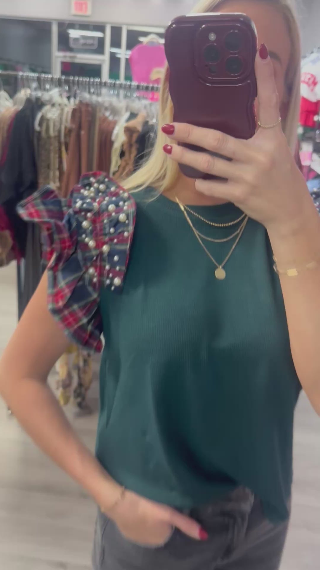 Mistletoe Magic Christmas Plaid Pearl Detail Top - Green