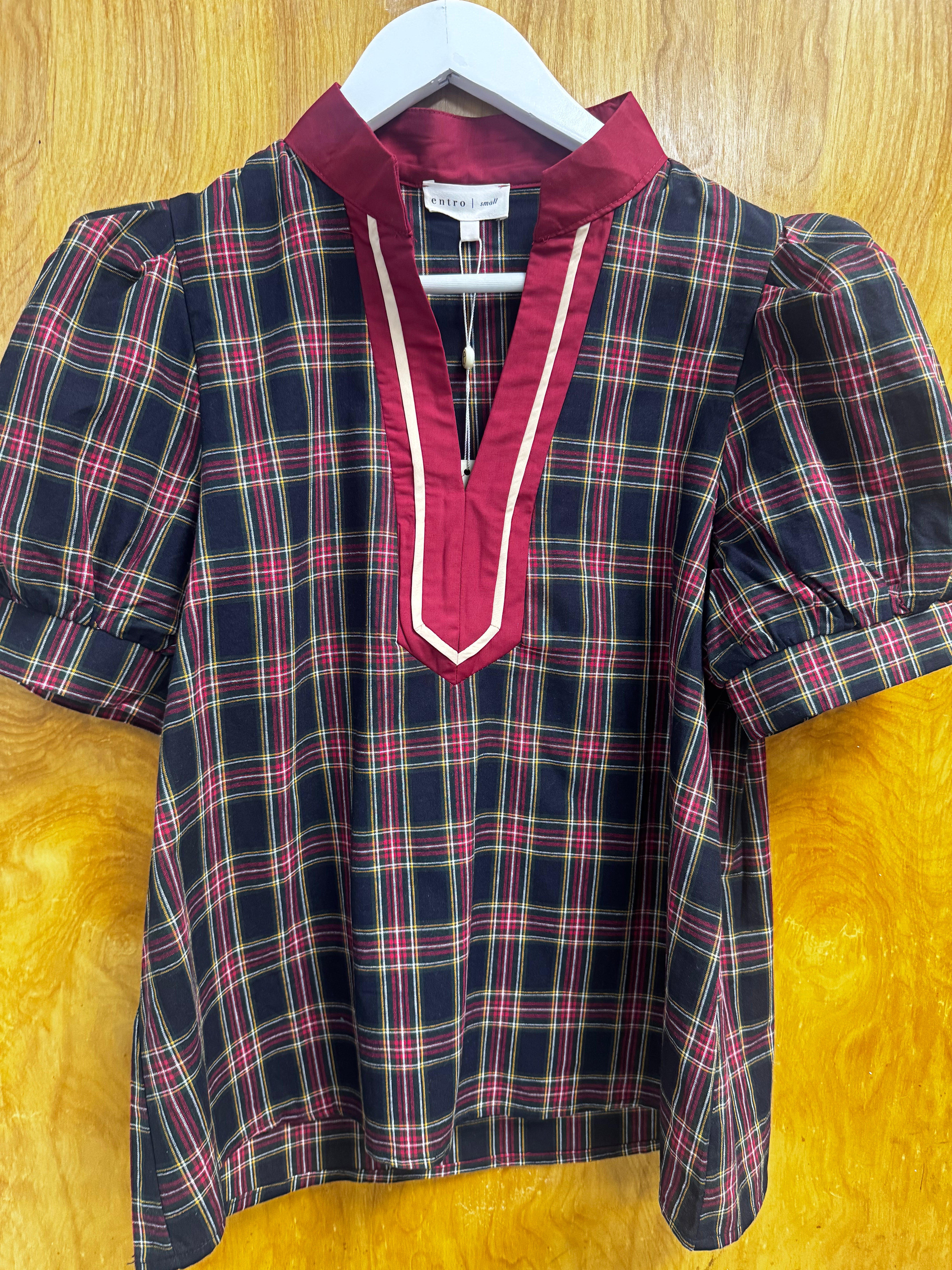 Plaid pattern cuff band short sleeve top featuring contrast accent caftan-inspired V-neck band. Unlined. Woven. Non-sheer. Lightweight.