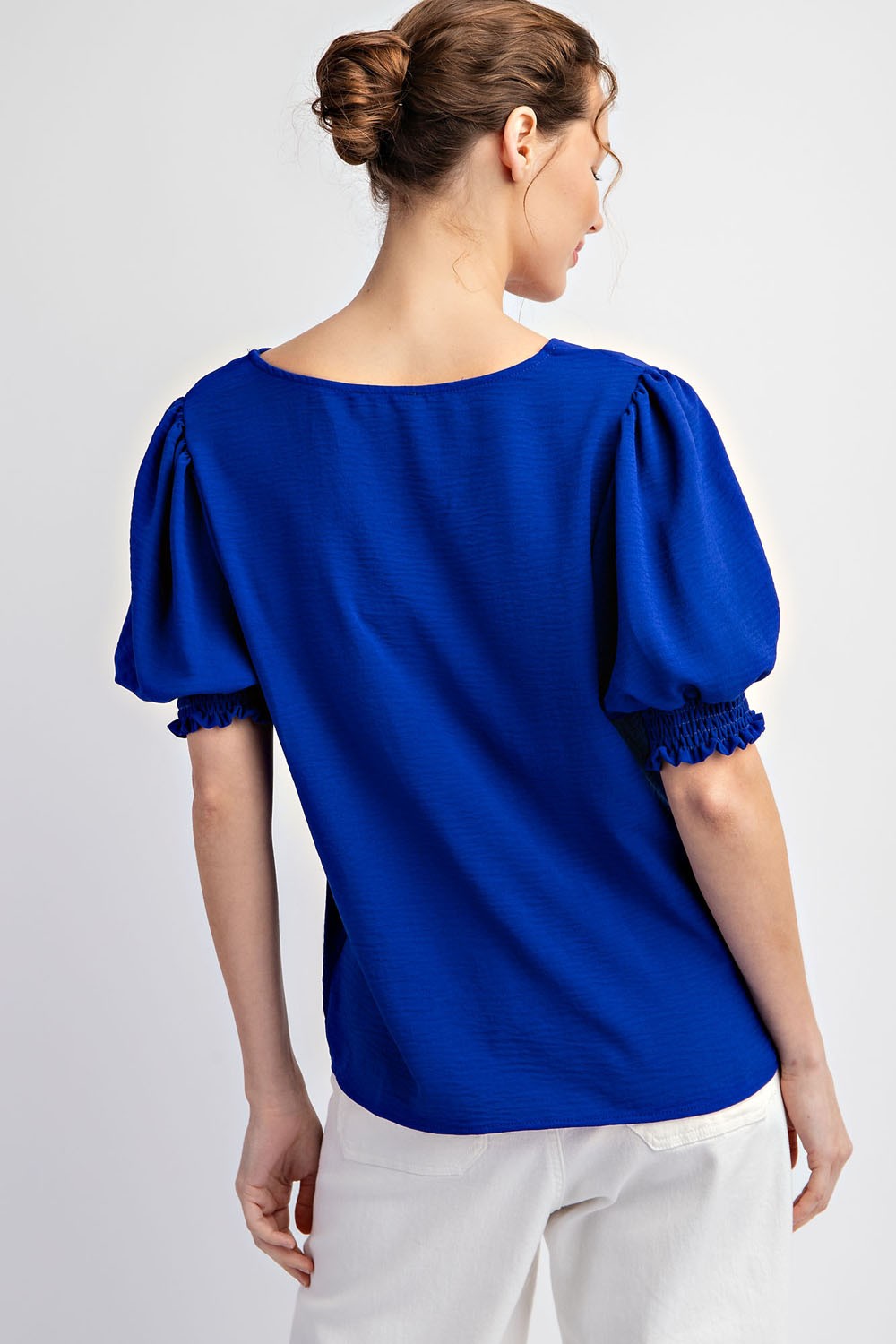 Solid short sleeve blouse top featuring a v-neckline, smocked cuffs for added comfort and a loose, relaxed fit that is perfect for any age range or size.