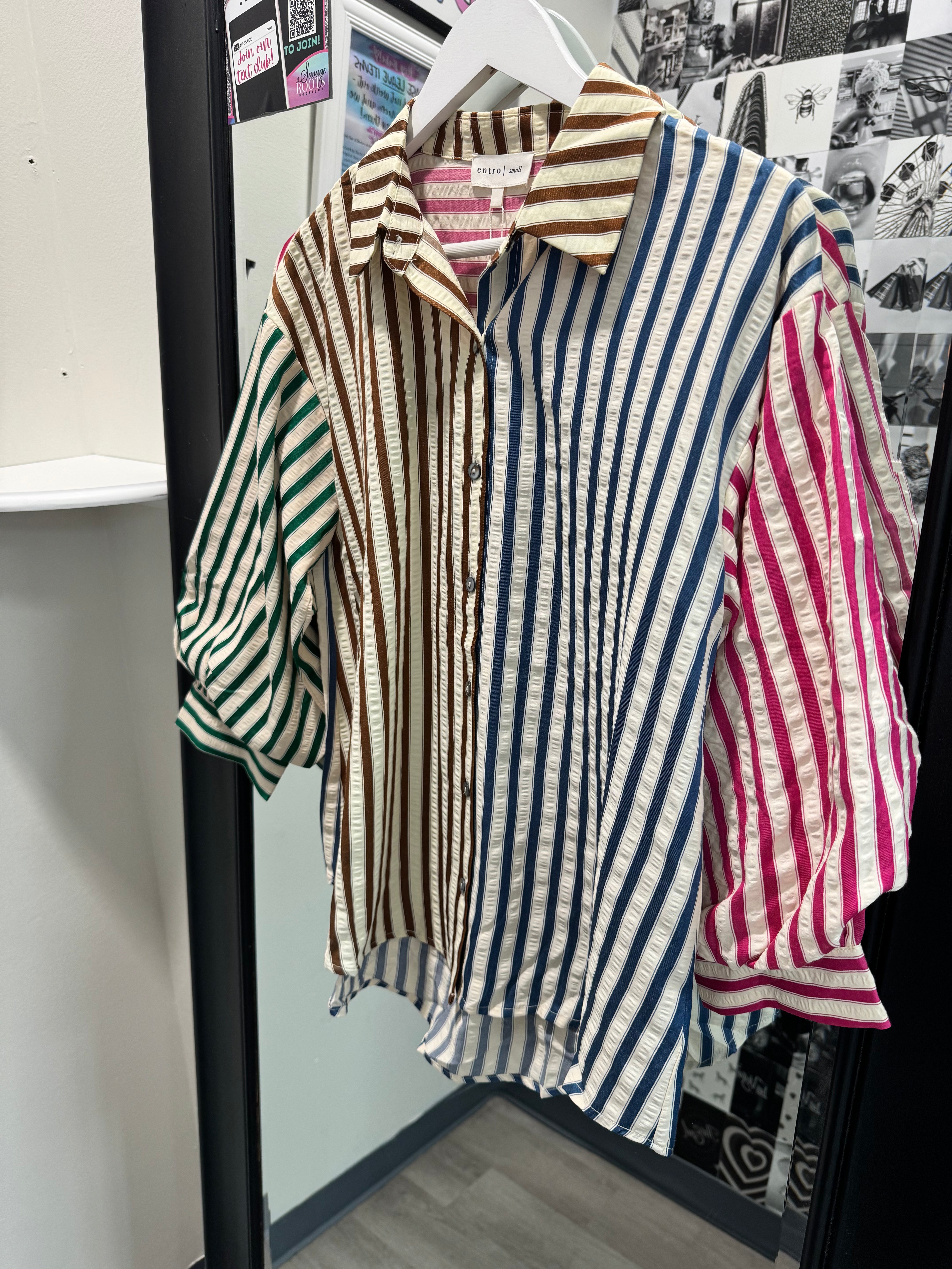 This She's Unique Striped Color Block Button Up features a distinctive colorblock stripe pattern that adds visual interest to a classic silhouette. Designed with a ¾ sleeve and a button-down collar, it offers a polished yet relaxed look. Crafted from lightweight, woven fabric that is non-sheer and unlined, this shirt ensures breathability and comfort throughout the day, making it ideal for layering or wearing on its own in warmer weather. Its expert construction balances style and functionality effortlessly.
