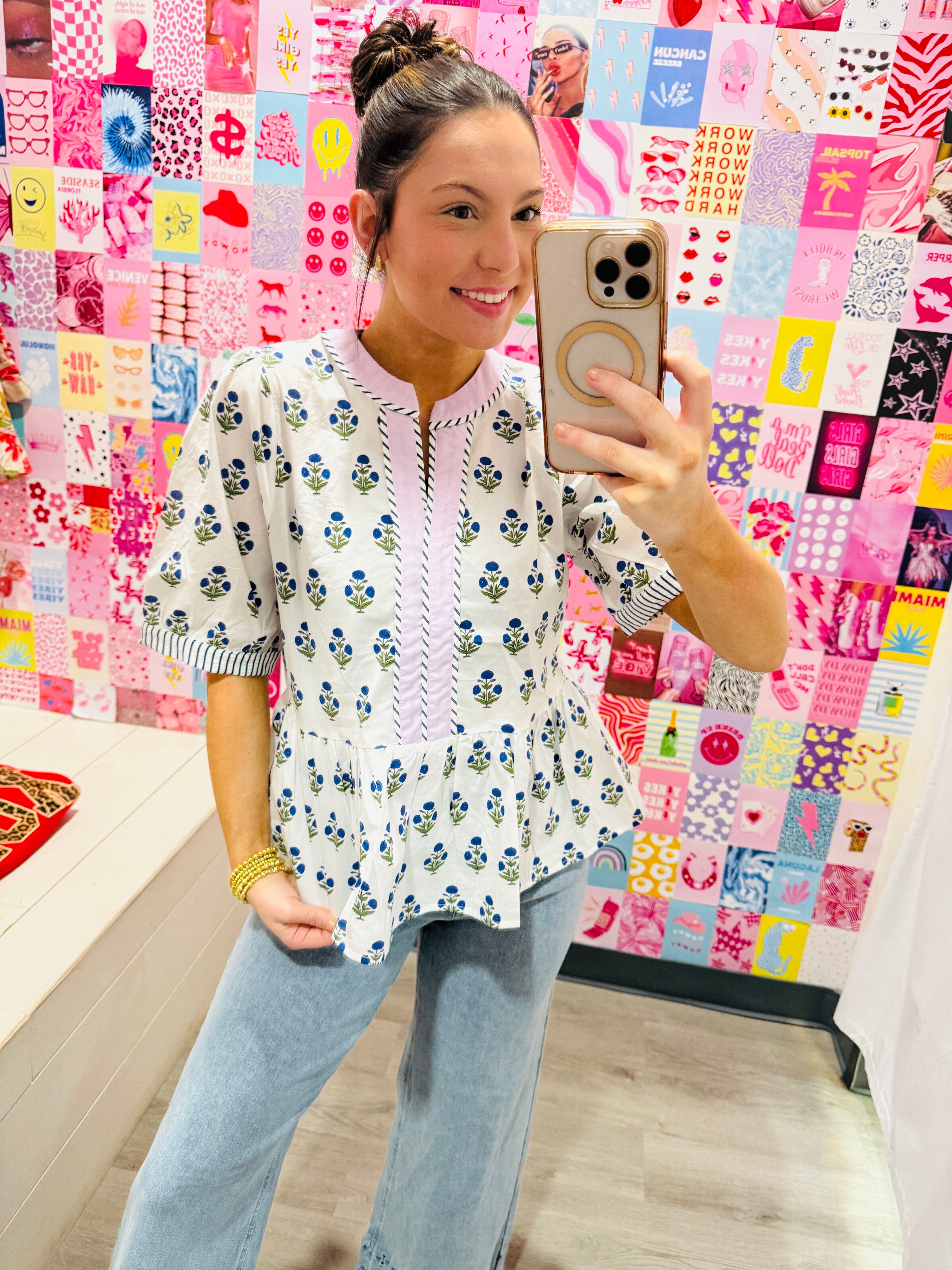 The Bluebell Daydream Peplum Top features the prettiest blue floral print on a crisp white base with soft lavender trim details that make this top feel extra special. The lightweight fabric keeps her airy and comfortable, while the peplum hem adds a flattering shape without feeling fussy.