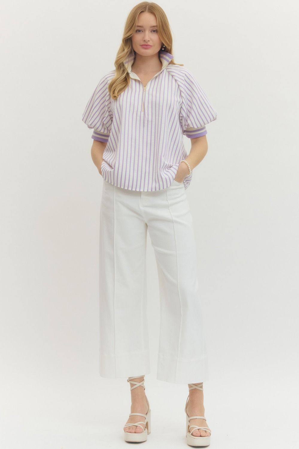 Preppy but make it comfy😍 This lavender + cream striped pullover is giving effortless polish with a little sporty edge. The half-zip neckline, structured collar, and statement sleeves make her feel elevated… while still being comfy enough for all-day wear.