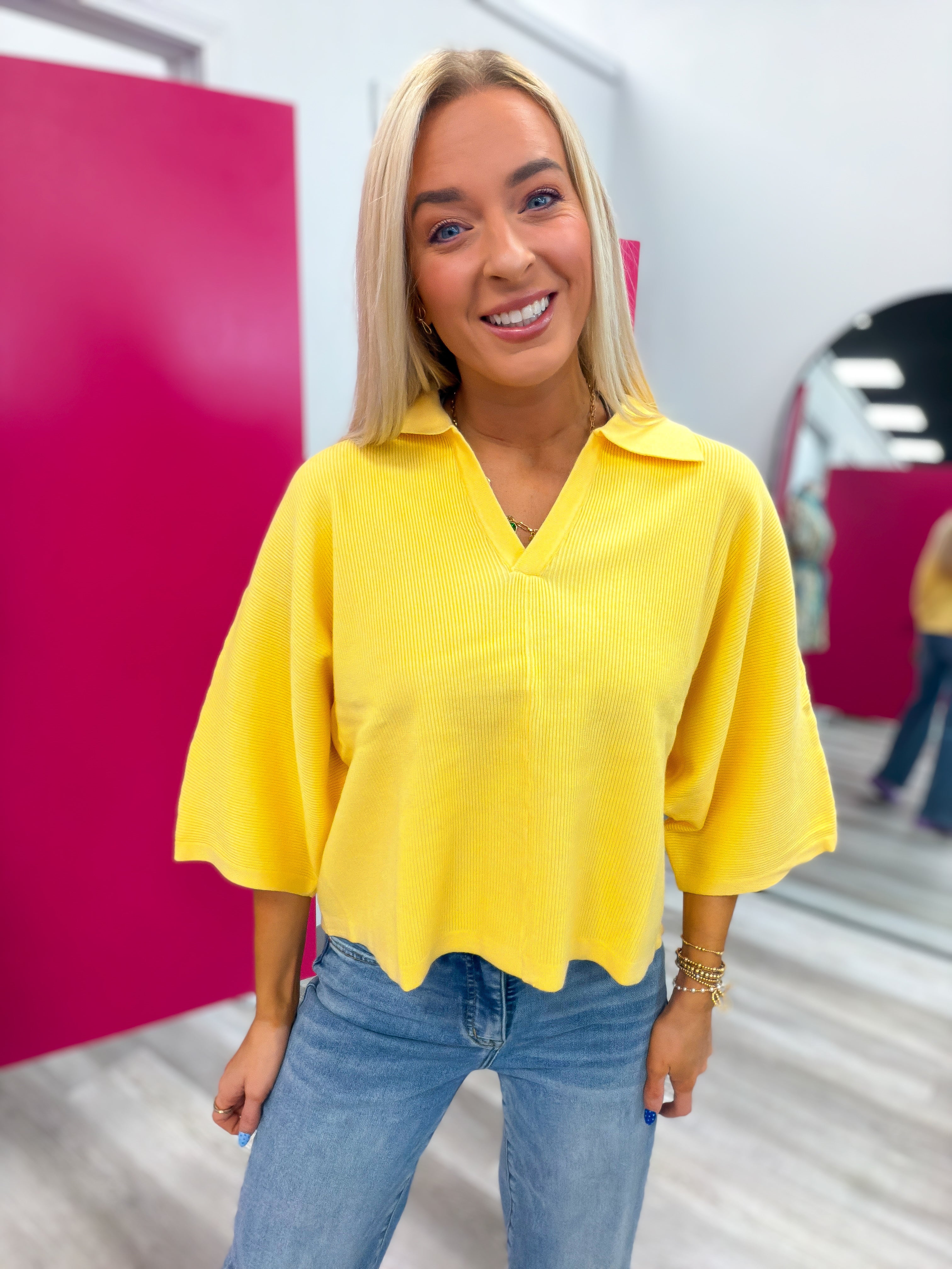This knit top is the perfect mix of comfy and polished! Featuring a flattering collared neckline with a subtle V-split, a soft ribbed knit texture, and relaxed dolman sleeves, it gives you that effortless “put-together” look without trying too hard. The lightweight feel makes it perfect for transitioning seasons, and it pairs beautifully with denim, trousers, or white bottoms for a clean spring outfit.