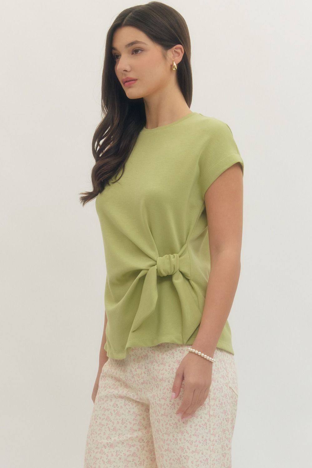 A soft, lightweight knit with the cutest side self-tie bow detail that gives you shape in all the right places. It’s relaxed, comfy, and easy — but that little tie moment takes her from “just a tee” to put together in seconds.