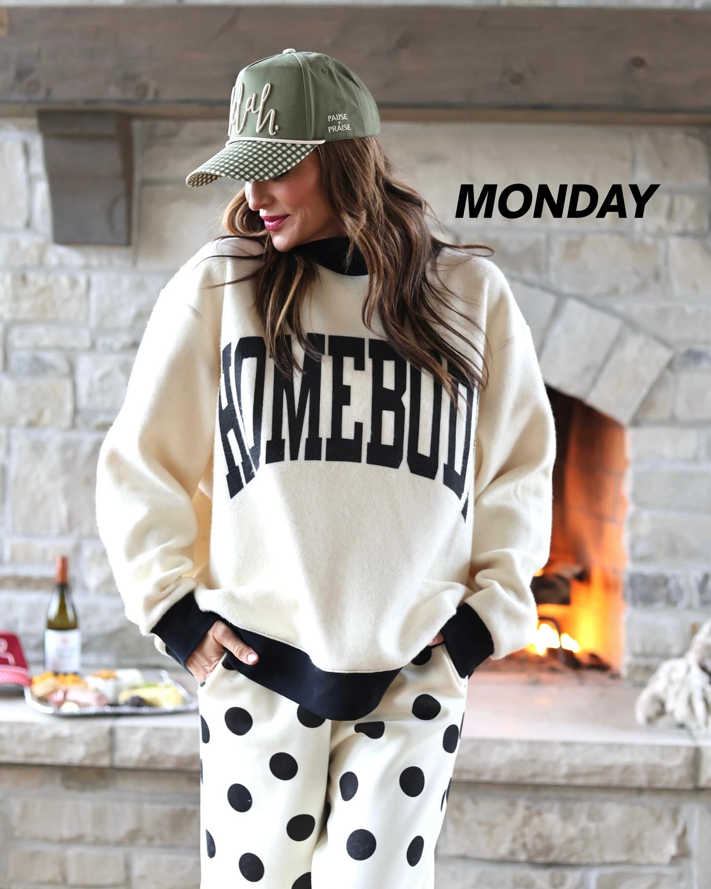 A reversible mockneck with bold “homebody” on one side + playful polka dots on the other. Flip it, style it, love it.