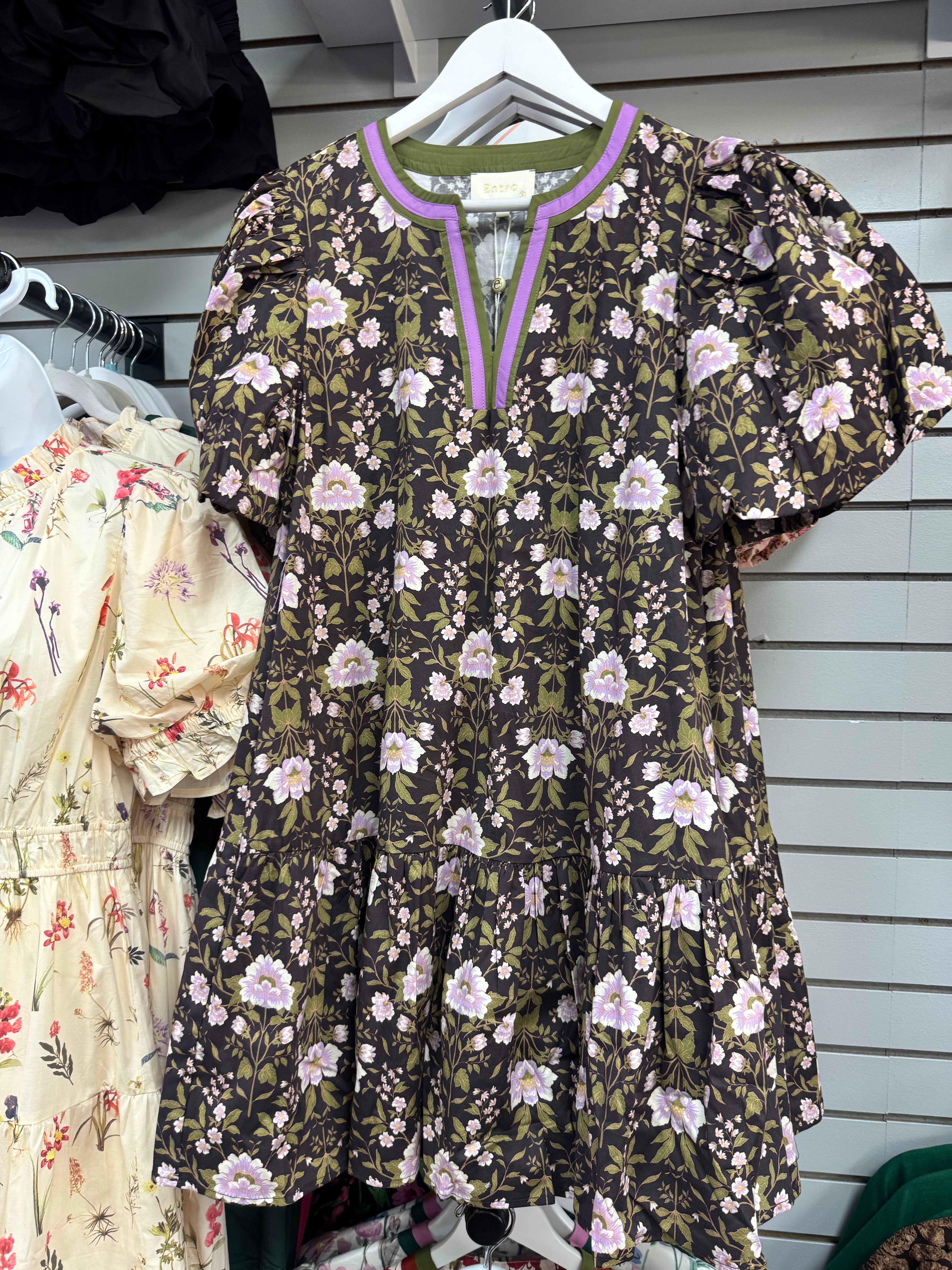 Botanical print short puff sleeve mini dress featuring contrast binding V-neck. Ruffle hem. Side pockets. Lined. Woven. Non-sheer. Lightweight.
