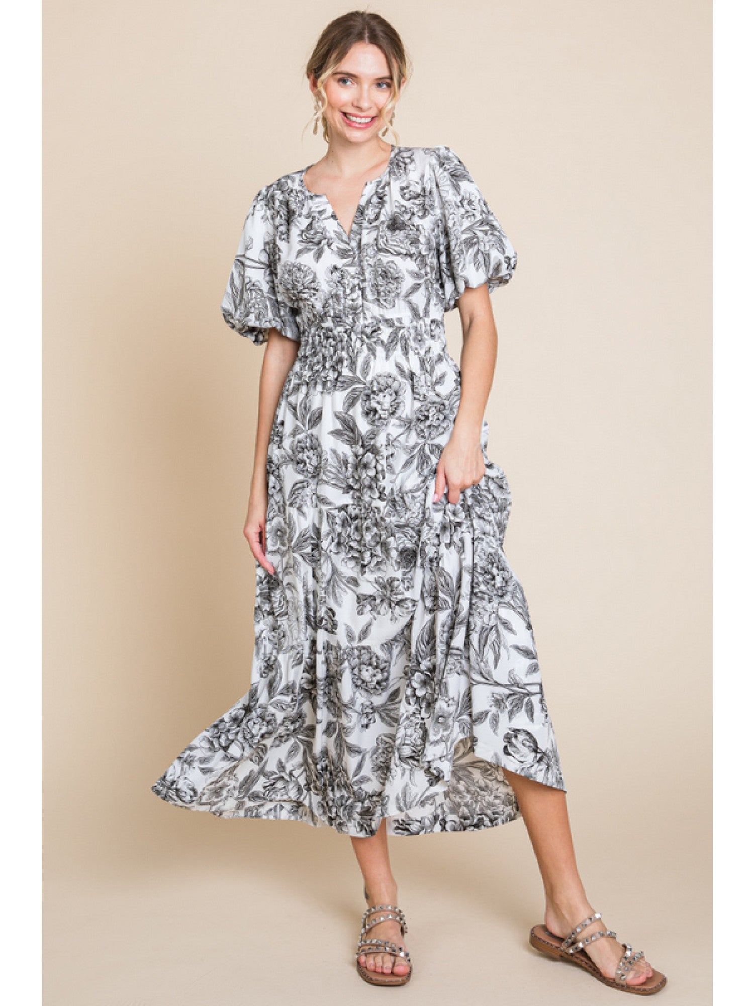 Floral print maxi dress with slit neck, smocked waistline, side pockets, short puffed sleeves, and tiered layer.