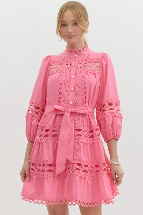 Solid 3/4 sleeve pearl button up mini dress featuring lace trim detail. Self-tie detail at waist. Lined. Woven. Lightweight.