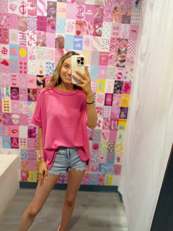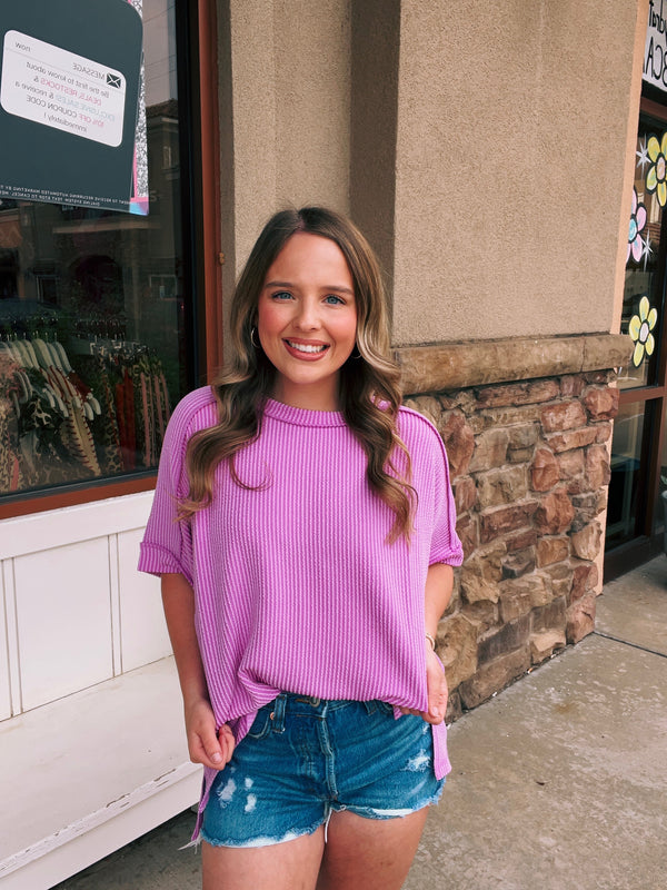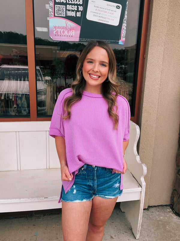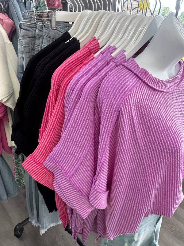 Corded Rib Short Cuff Sleeve Raw Edge Top