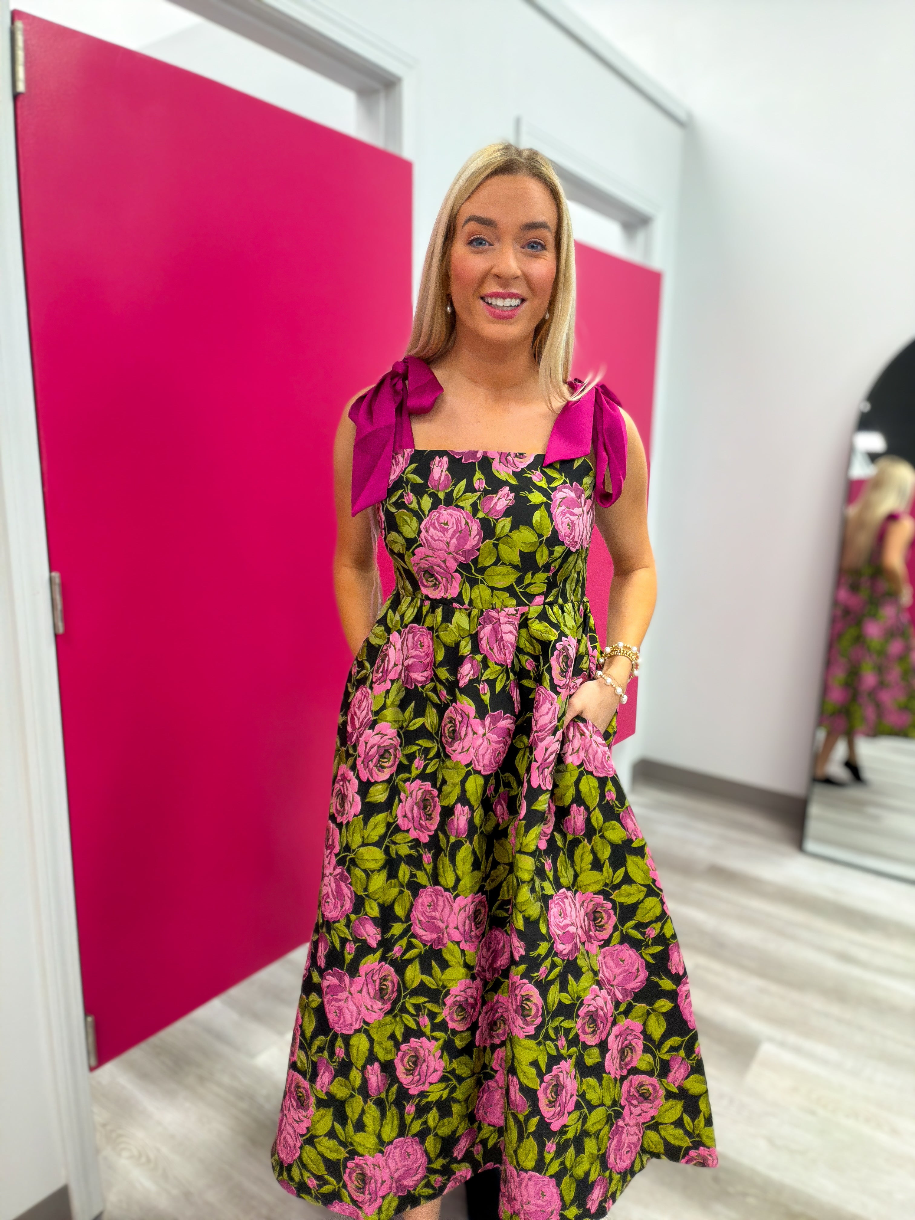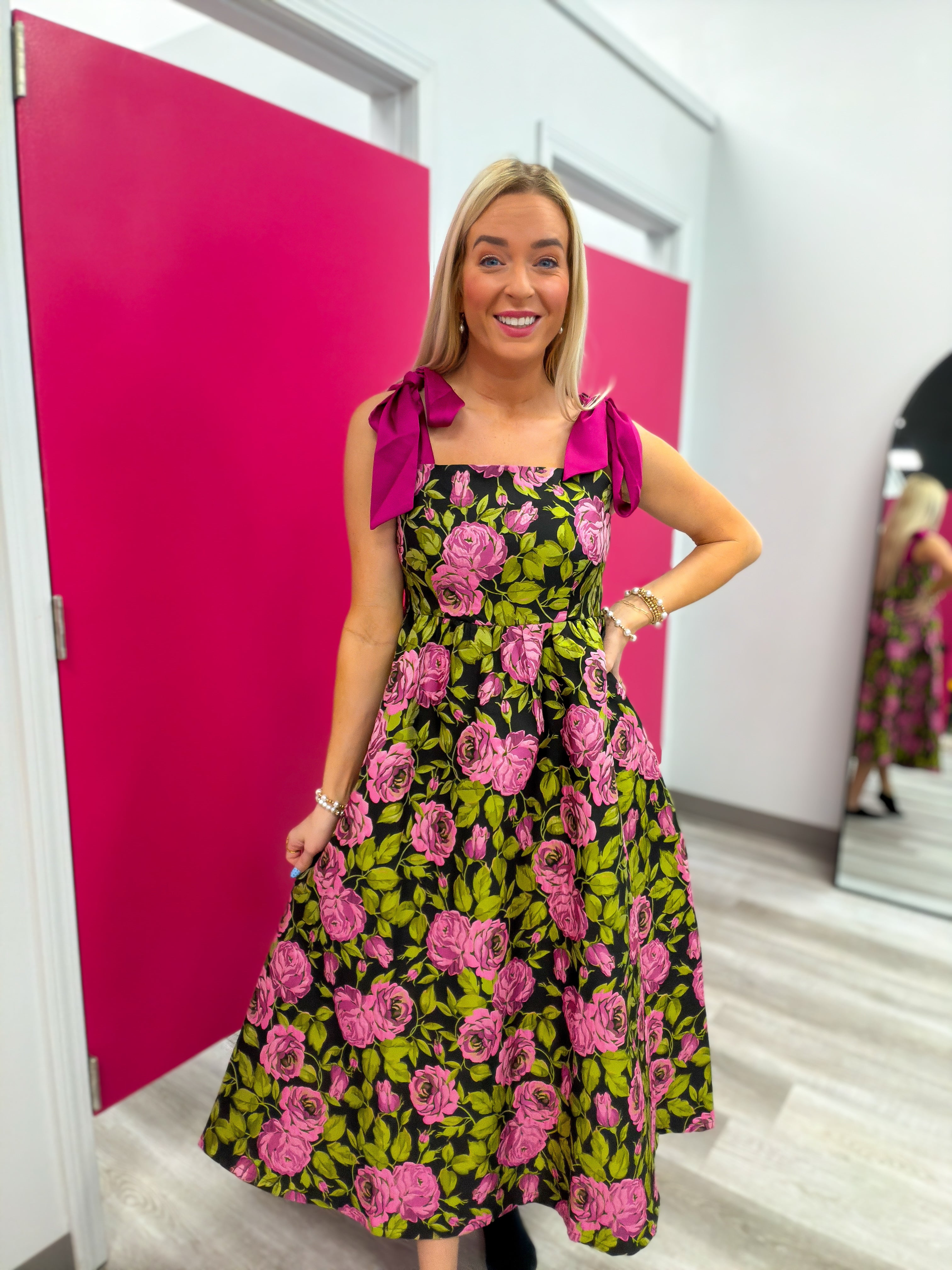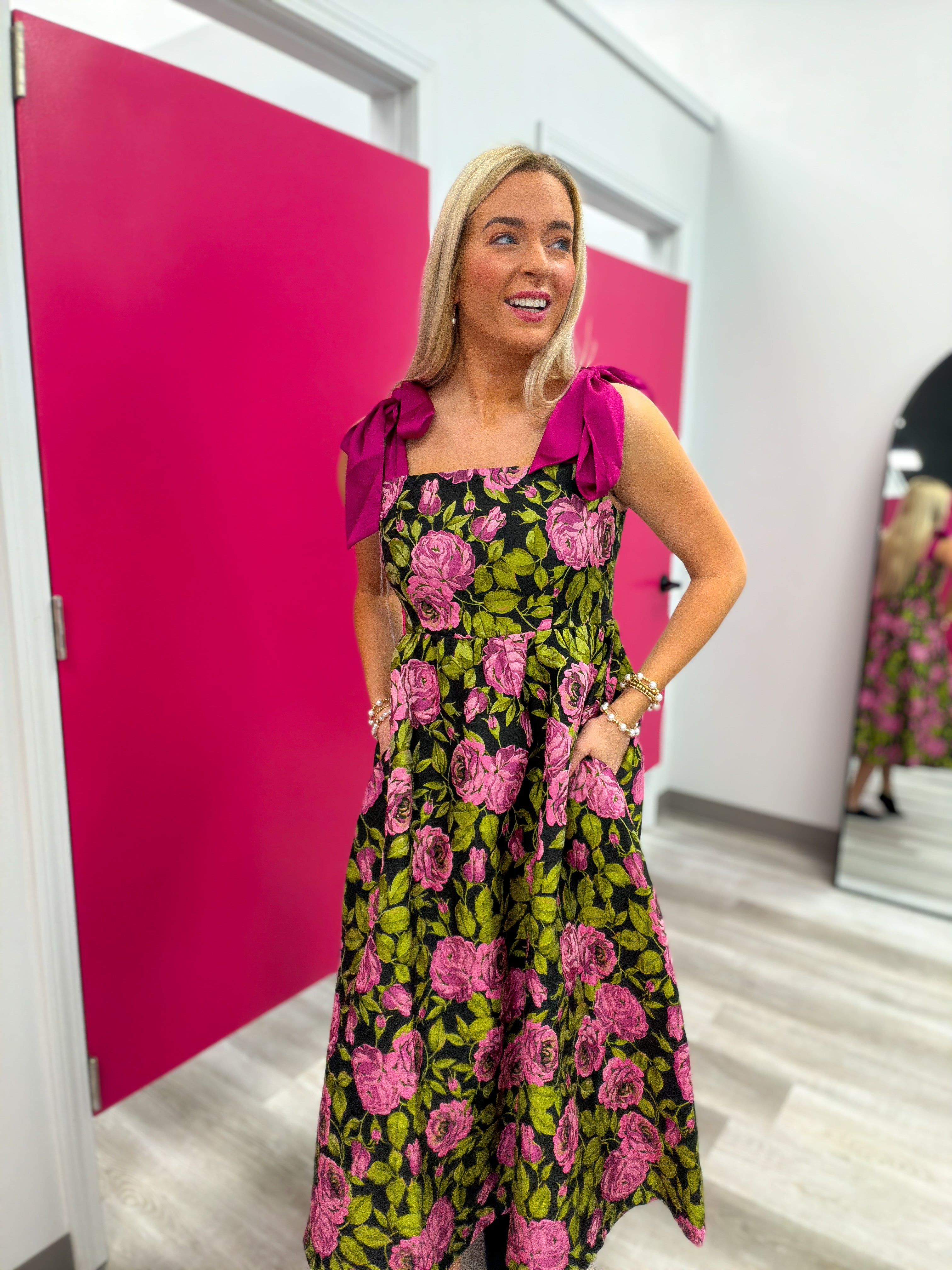 This dress is one of those pieces that turns heads the second you walk in. The bold floral print, the sweetest bow tie shoulders, and a twirl worthy skirt make it an instant favorite… and yes, it has pockets 🙌