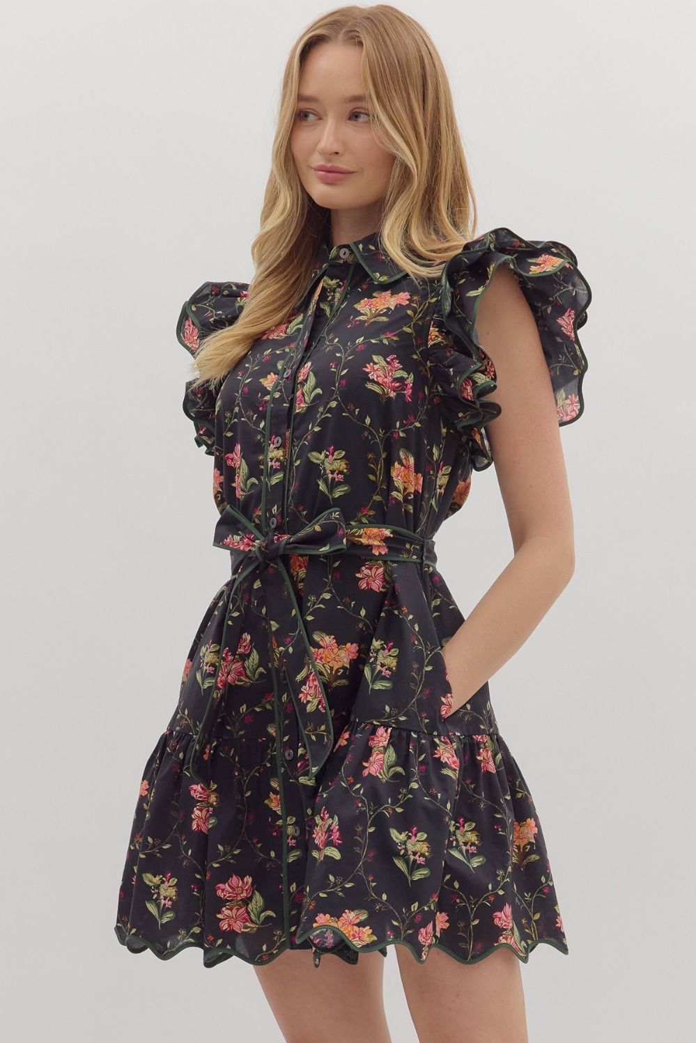 Embrace effortless elegance with this Floral Wish Dress in black. Designed with flutter sleeves and a tiered skirt, it offers a flattering silhouette enhanced by a self-tie belt to define your waist. The scalloped contrast piping adds delicate charm along the collar, placket, sleeves, belt, and hem. Lightweight and fully lined, this woven mini dress features convenient side pockets and a button-front closure, perfect for stylish comfort in any season.