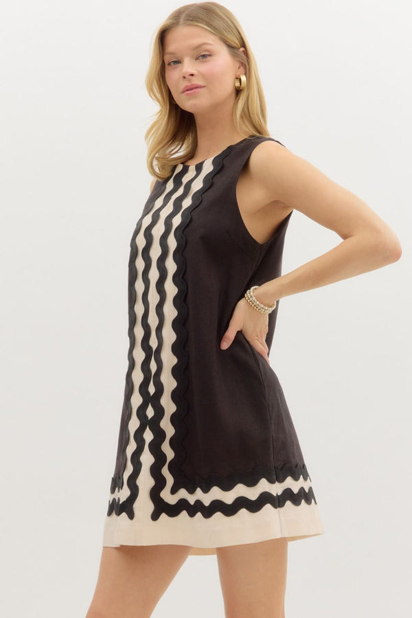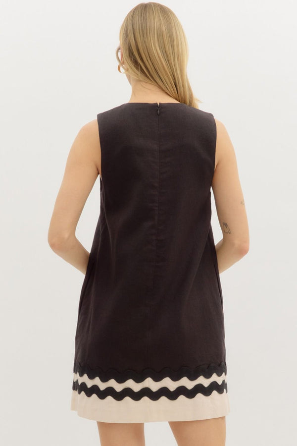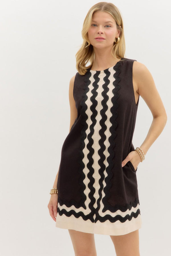 Colorblock sleeveless pullover mini dress featuring contrasting oversized ricrac trim accent at front. Pockets at sides. Zipper closure at back. Lined. Woven. Non-sheer. Lightweight.