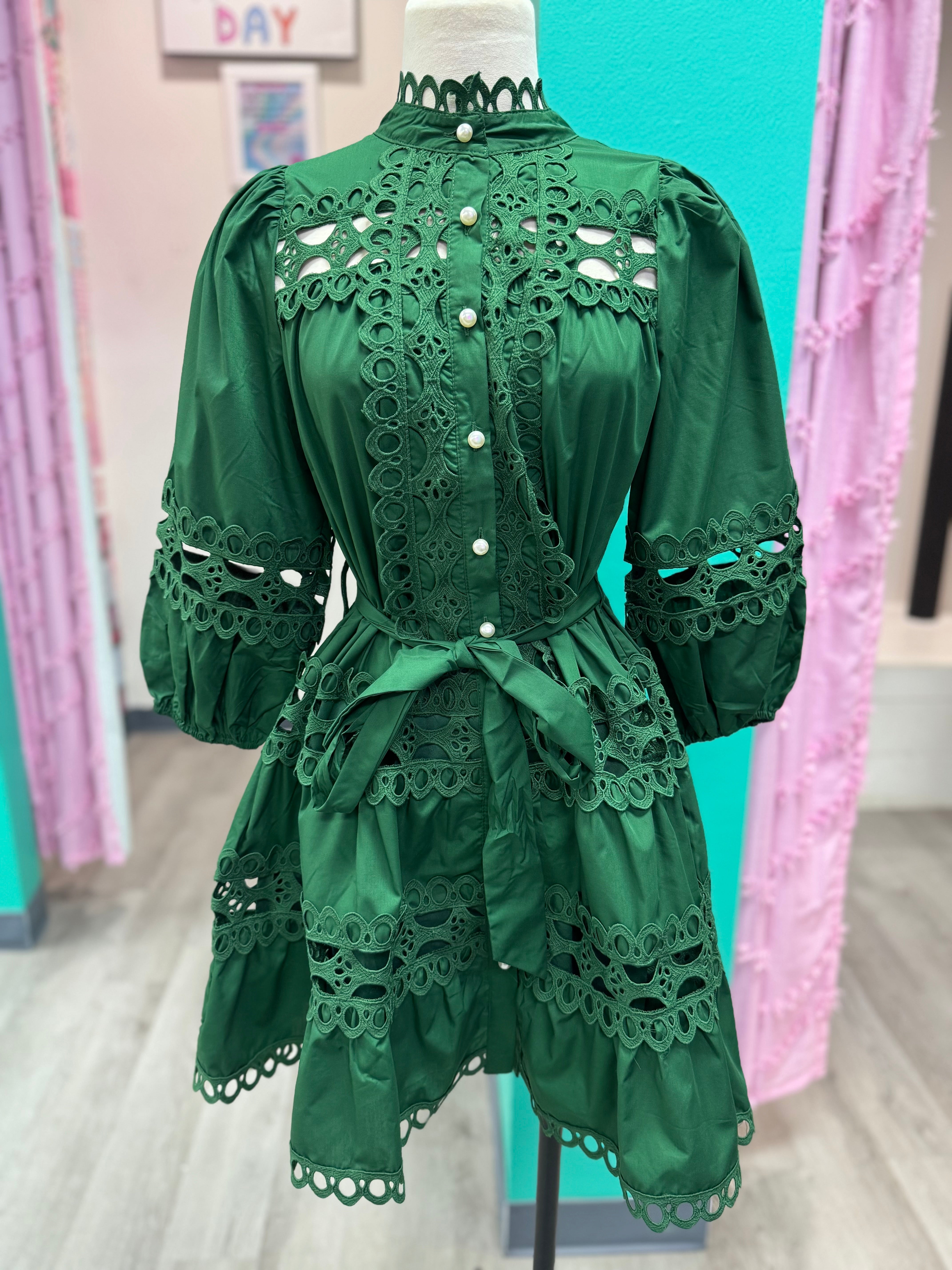 Solid 3/4 sleeve pearl button up mini dress featuring lace trim detail. Self-tie detail at waist. Lined. Woven. Semi-sheer. Lightweight.