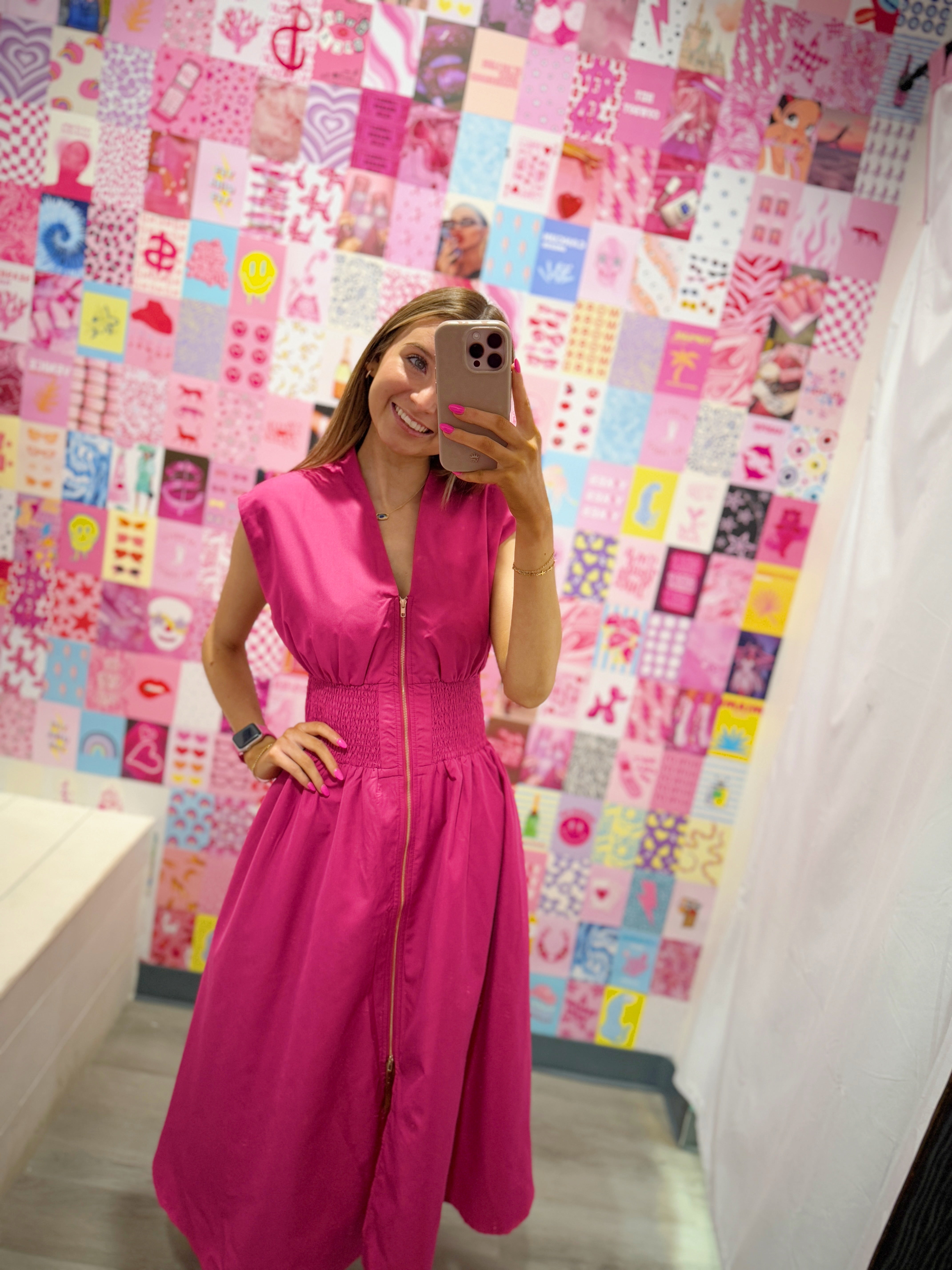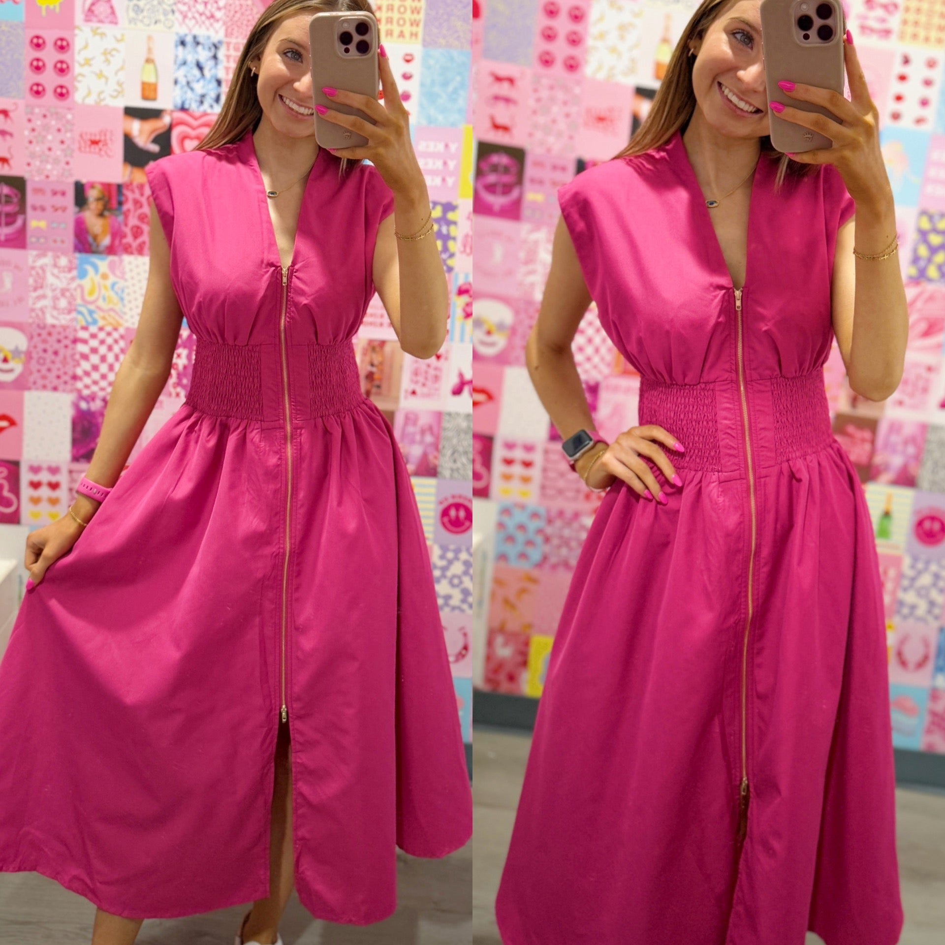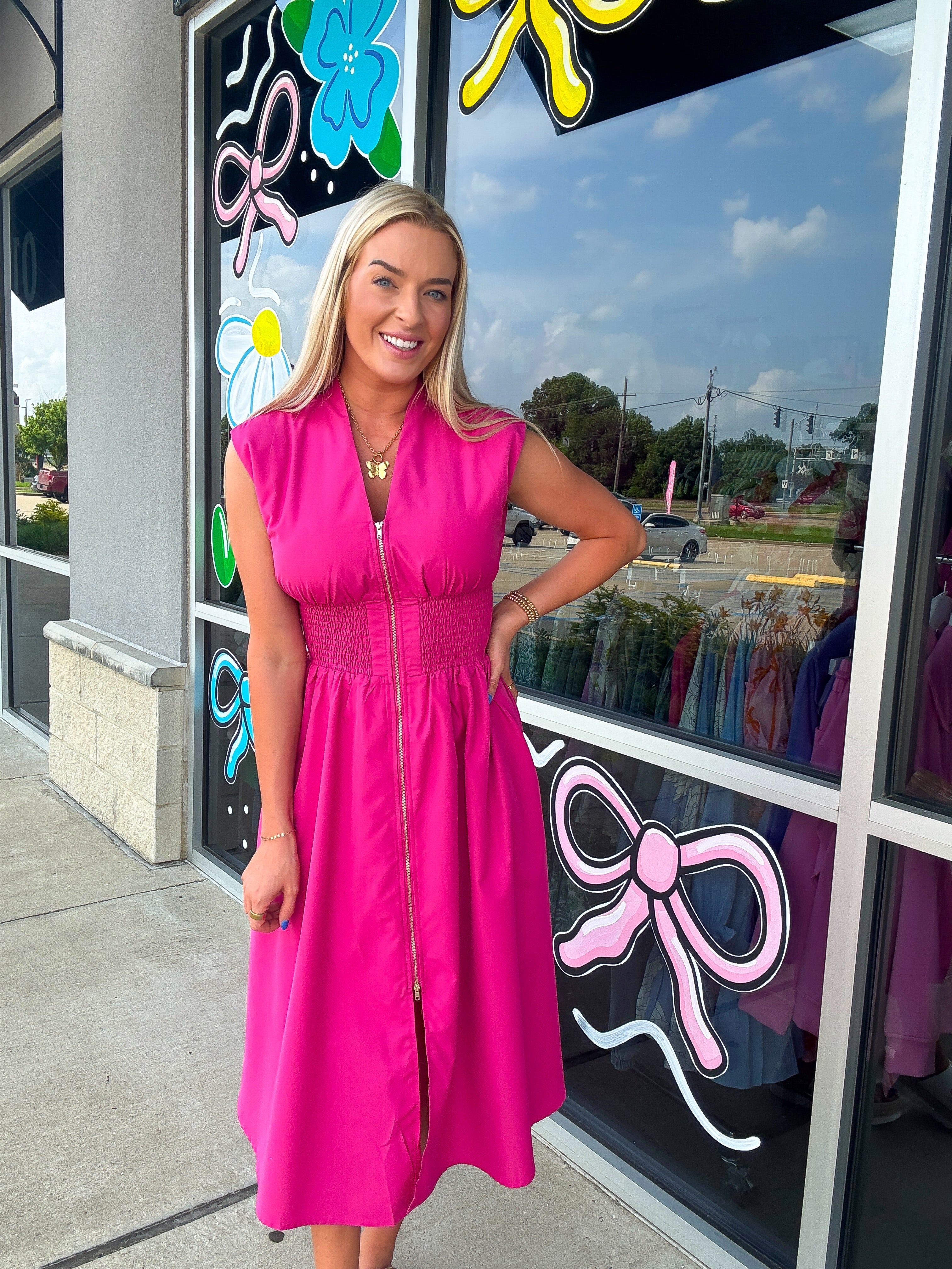 Unlock your playful side with our Midi Zipper Dress! This solid v-neck sleeveless dress features a dual zipper at the front, adding a touch of edge to the classic midi style. With smocking at the waist and hidden pockets at the sides, this dress offers both style and functionality. Lined and non-sheer, it's perfect for any occasion. Lightweight and woven for comfort.