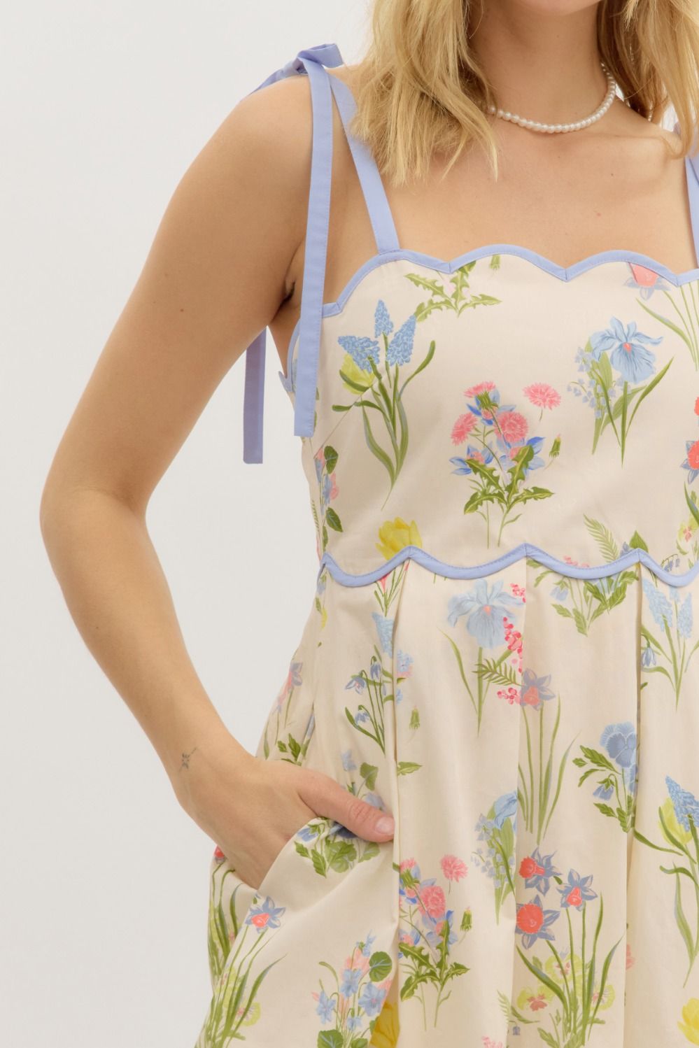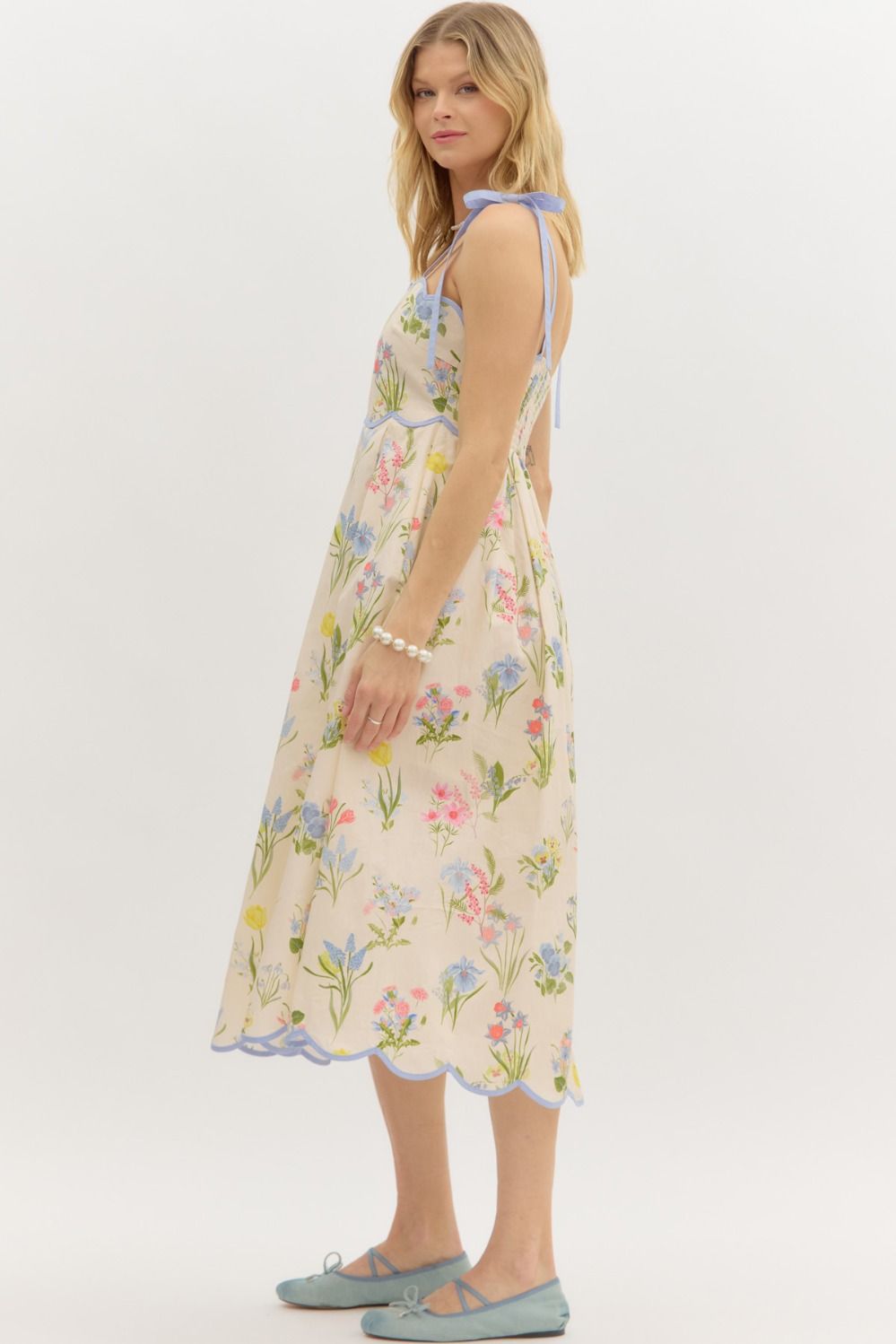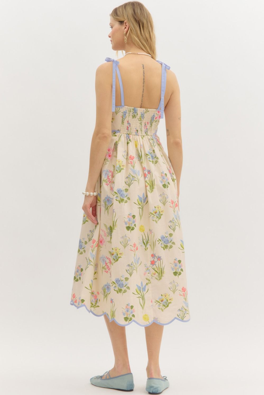 Floral print shoulder tie pullover midi dress featuring contrast binding scallop edge finish. Smocking closure at back. Pockets at sides. Lined. Woven. Non-sheer. Lightweight.