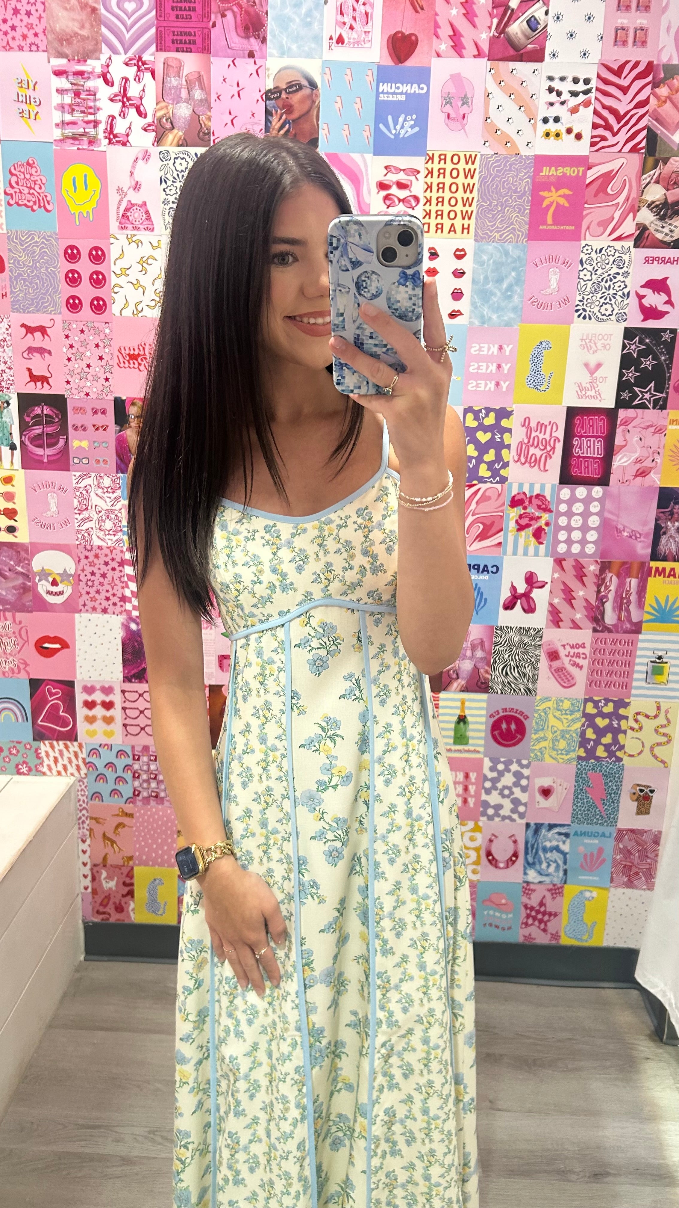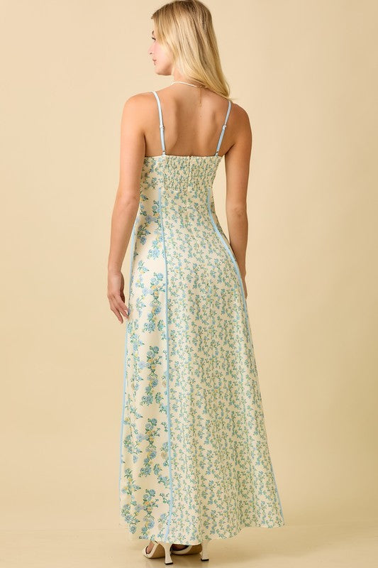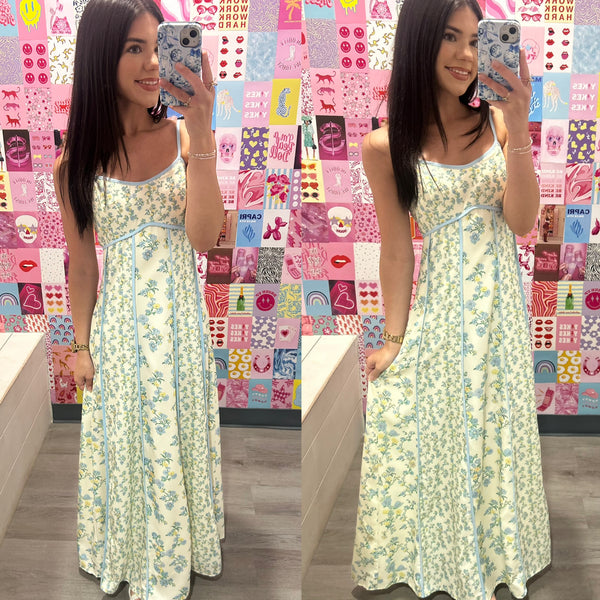 Patchwork Floral Maxi Sleeveless Dress With Contrast Binding Detail Bohemian and breezy, this sleeveless maxi dress features a patchwork of floral prints for a vintage-inspired, free-spirited look. Lightweight and flowy, it's perfect for summer days, beach strolls, or relaxed weekend outings.