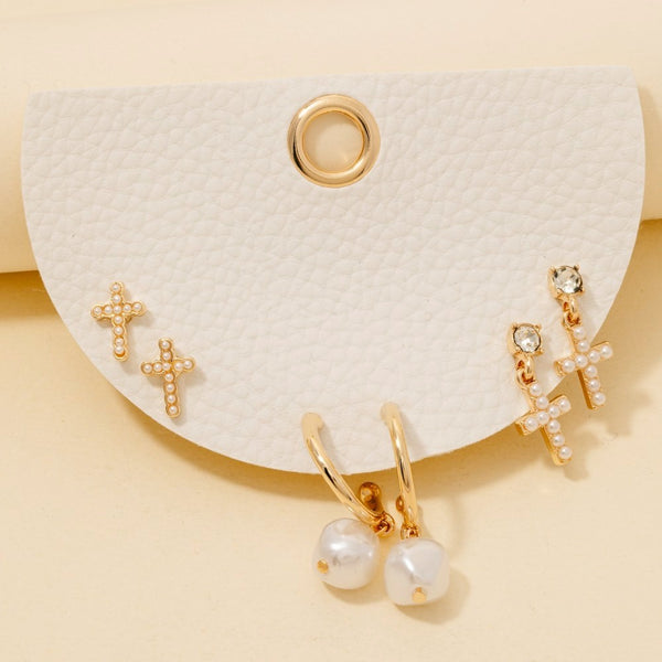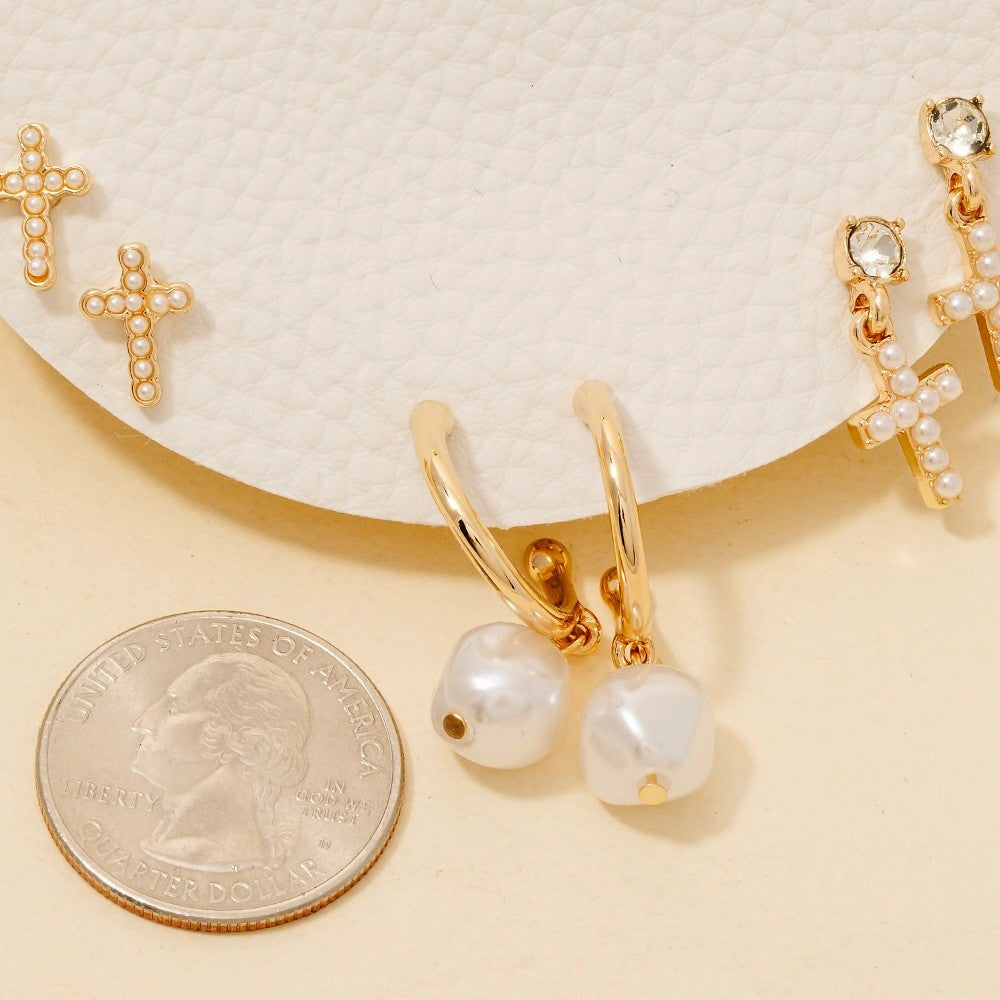 Pearl Pave Cross And Charm Mixed Earrings Set