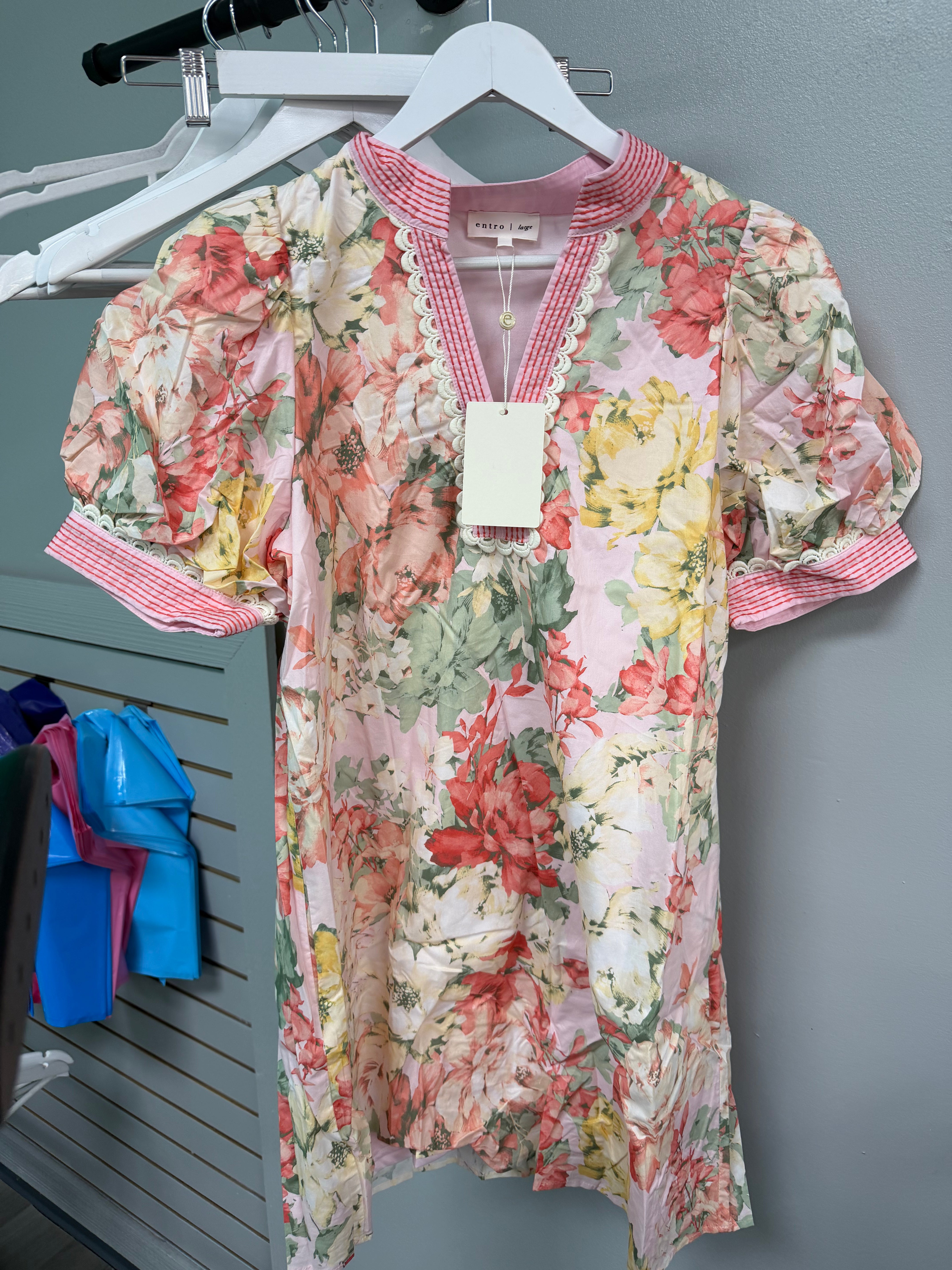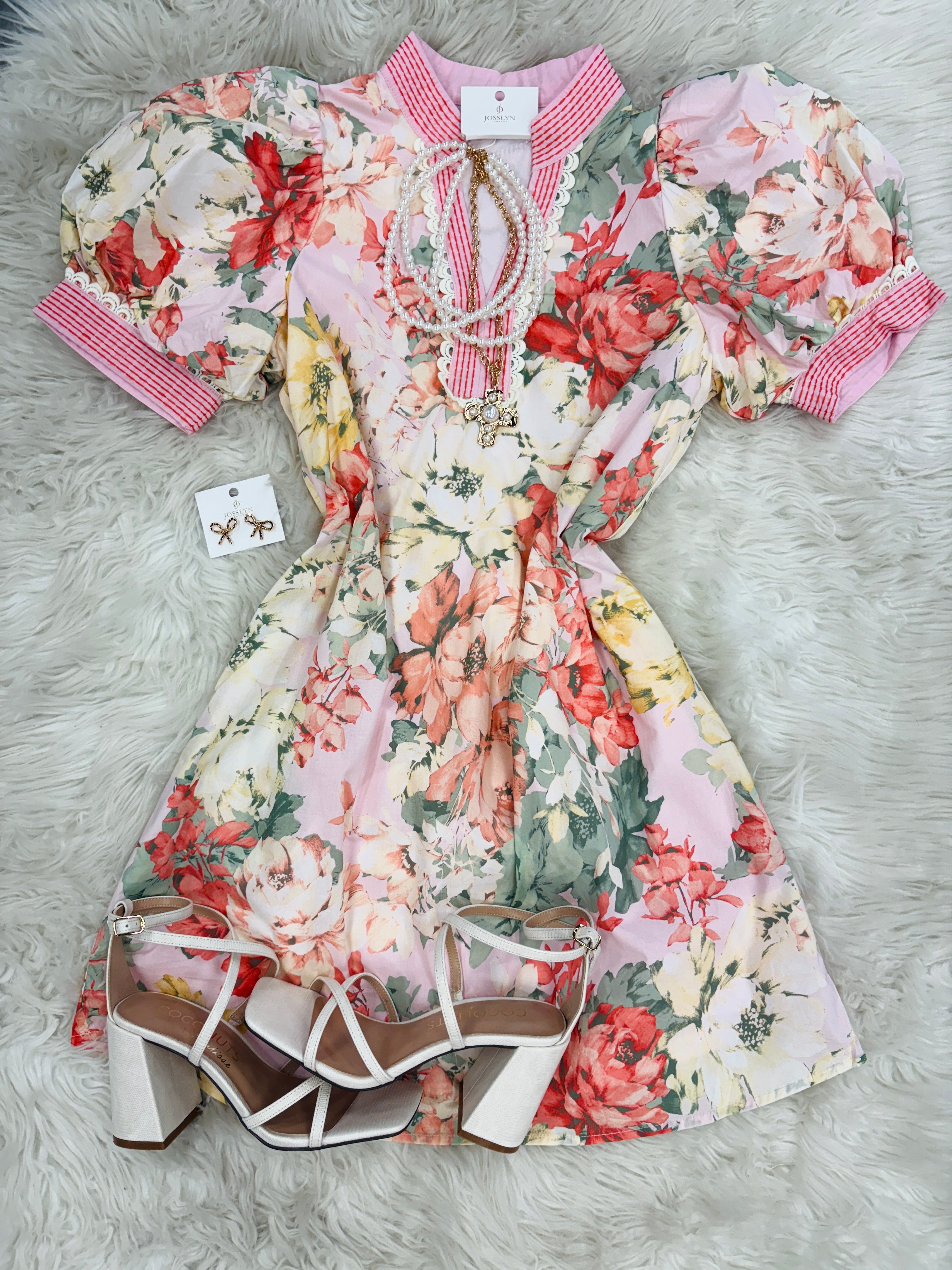 This Dress is one of those effortless pieces that instantly feels like spring. Featuring a soft blush background with beautiful coral, yellow, and green floral tones, this dress has such a fresh and feminine feel.