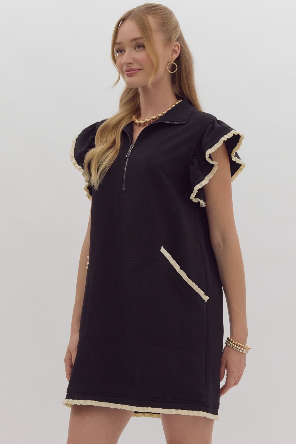 Solid half zip collared ruffle sleeve mini dress featuring contrasting trim. Pocket at sides. Unlined. Knit. Non-sheer. Lightweight.