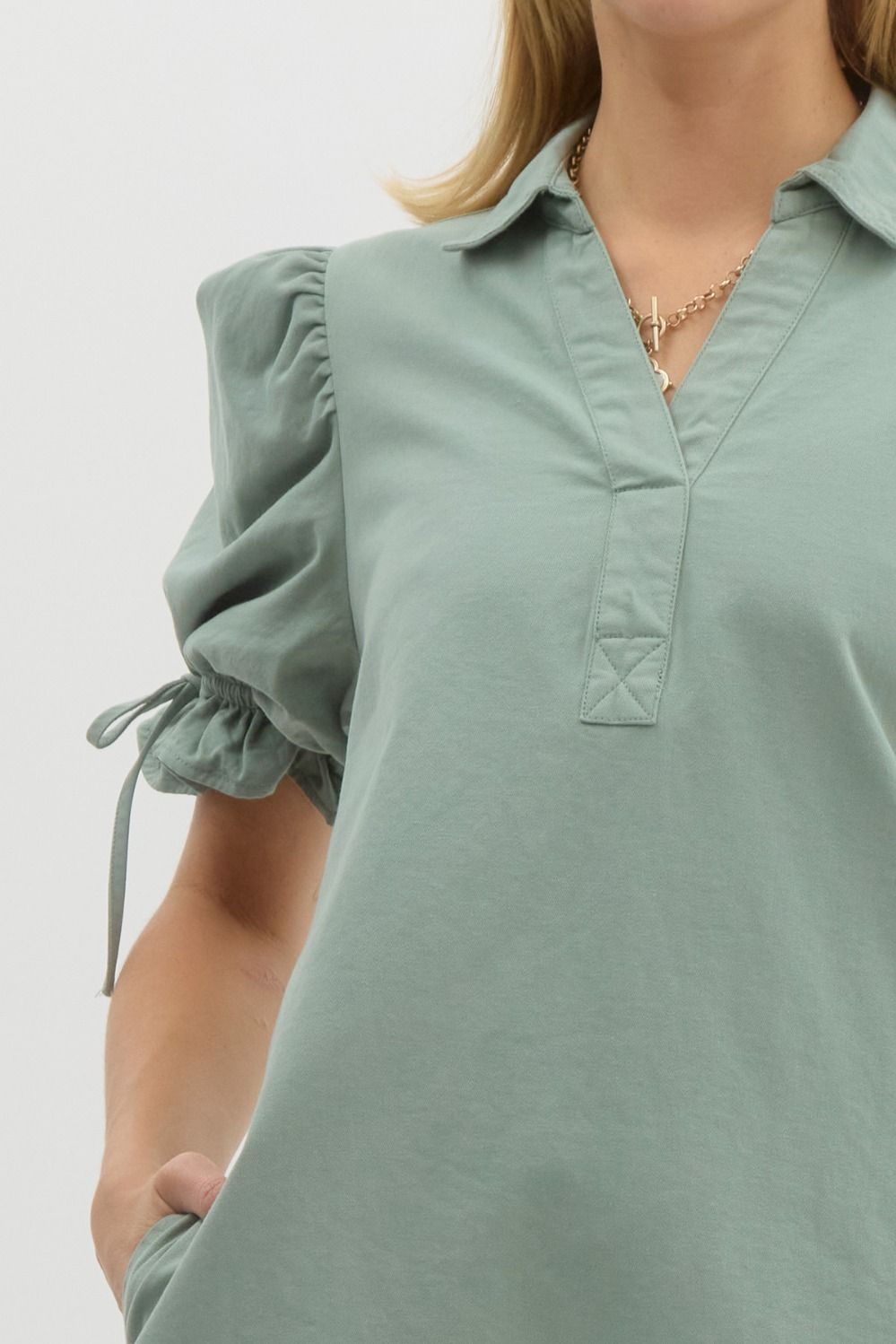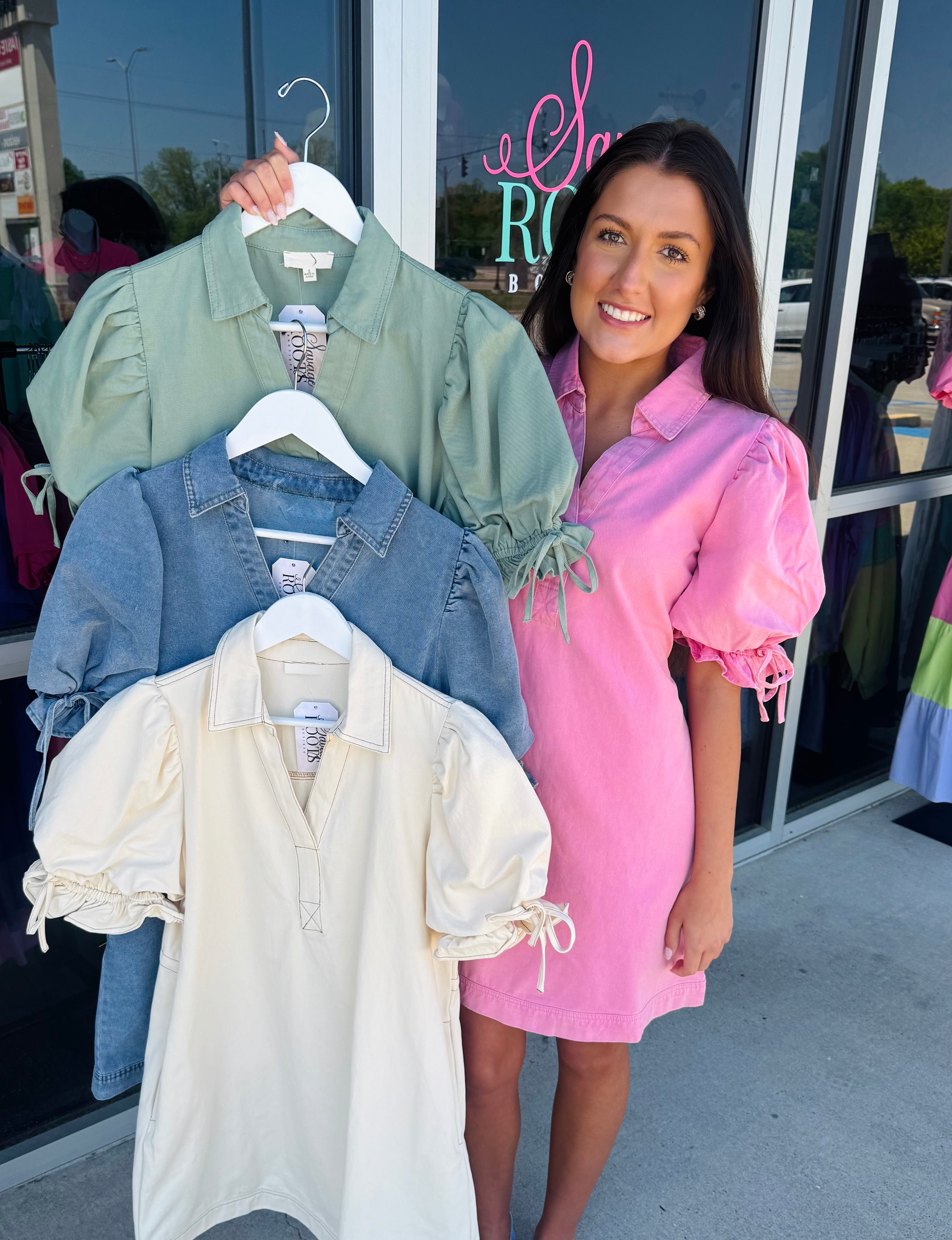 Solid mini dress featuring adjustable waist at back. Elasticated short bubble sleeve featuring accented fixed bow. Pockets at side. Unlined. Woven. Non-sheer. Lightweight.