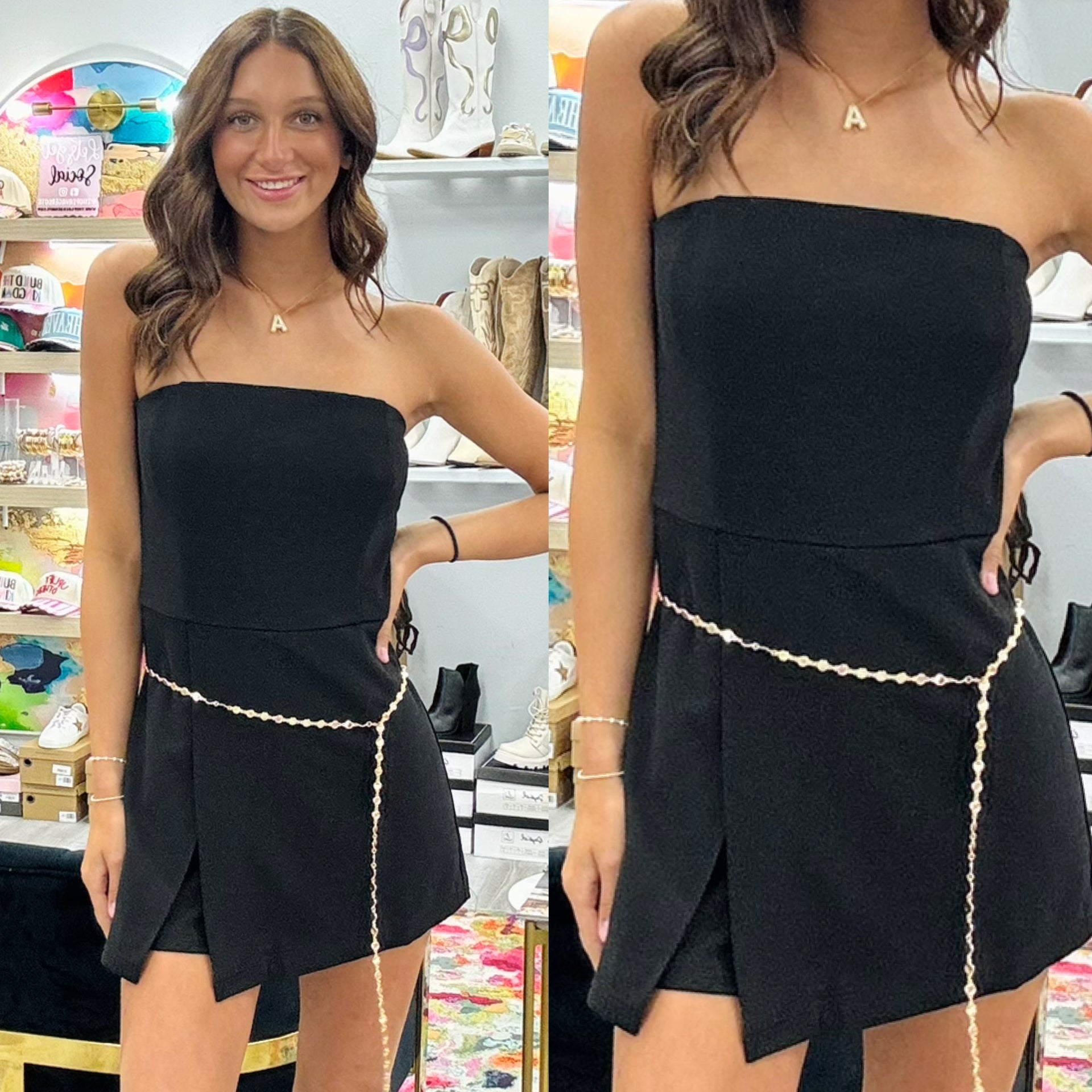 Meet the little black romper that does it all. This strapless style features a clean, structured bodice with a flattering drop waist and flowy skirt overlay that gives the look of a mini dress while keeping the comfort of a romper. It’s one of those pieces you can throw on and instantly look put together — perfect for date night, dinners, concerts, or any event where you want something simple but stunning.
