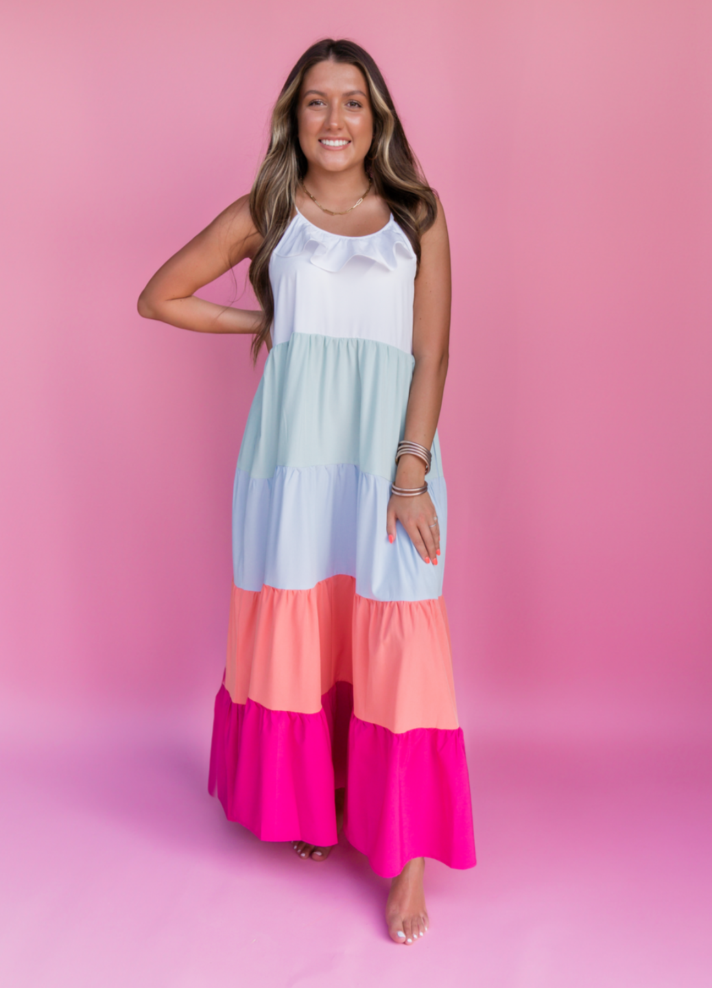 Spaghetti strap colorblock tiered midi dress featuring ruffle detail at bust. Self tie shoulder straps. Pockets at side. Lined. Woven. Non-sheer. Lightweight.