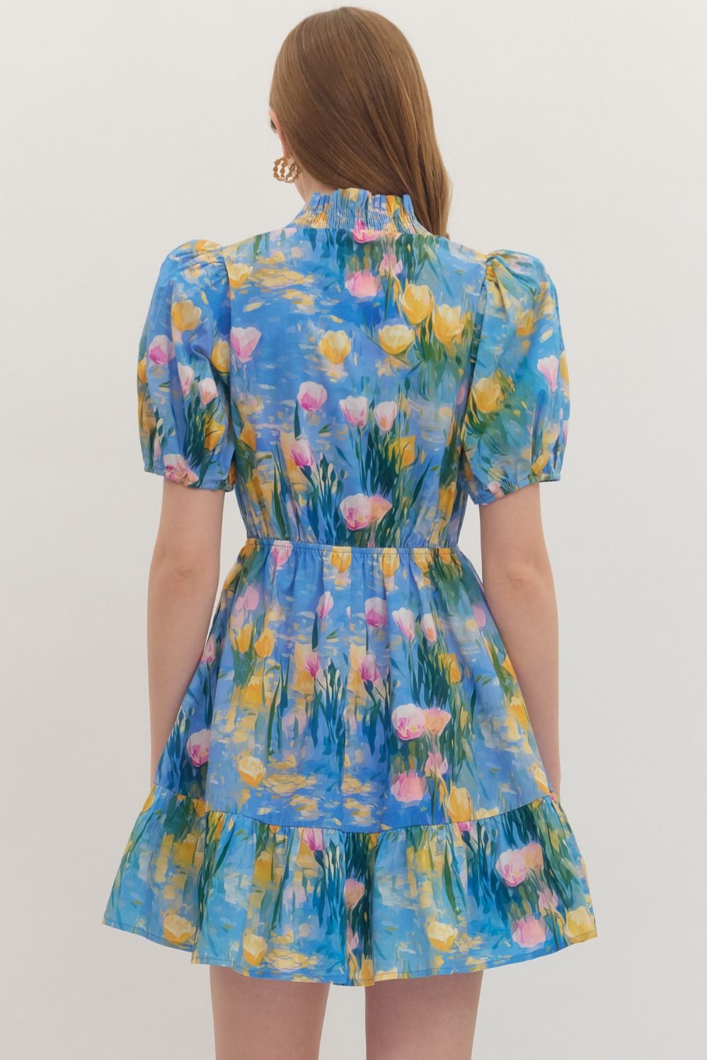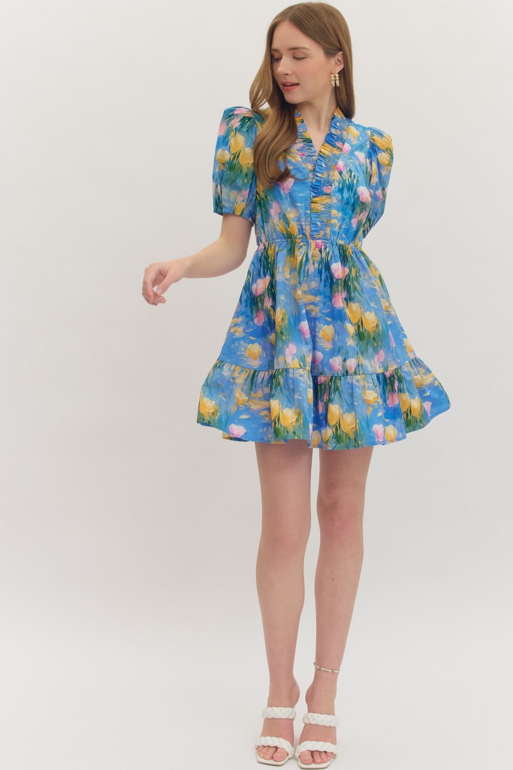 Featuring a dreamy botanical print with soft blues, pinks, and yellows that POP, this one is perfect for everything from brunch to showers to weekend plans. The ruffled neckline + puff sleeves add that extra feminine touch, while the elastic waist keeps it comfy and flattering.