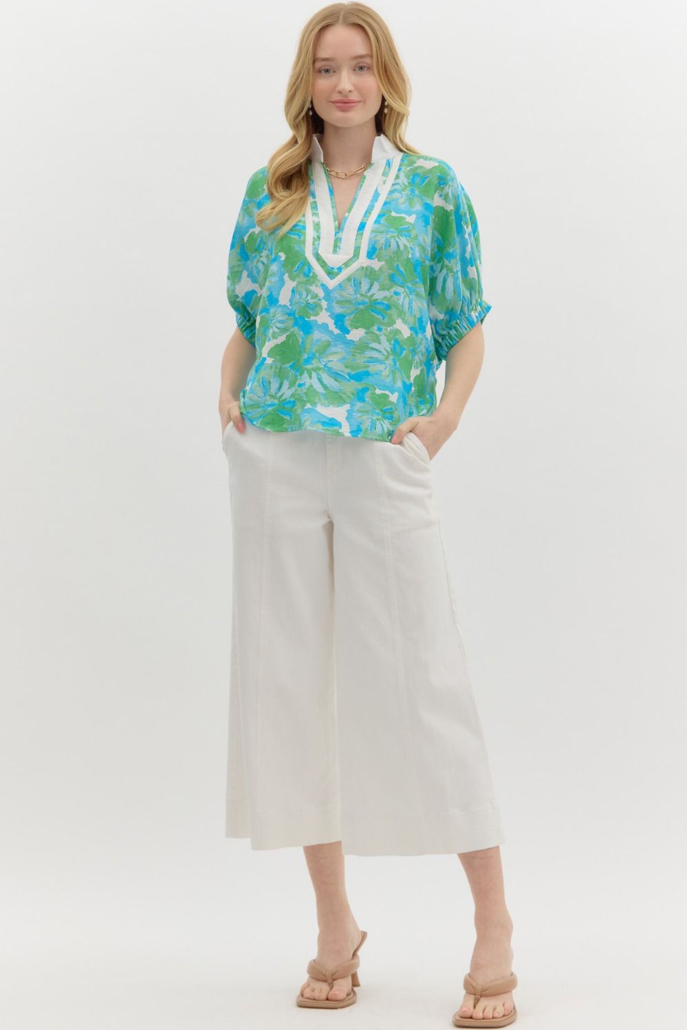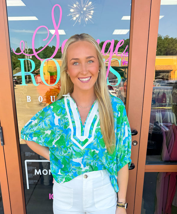 Floral print elasticated sleeve band dolman top featuring contrast accented caftan-inspired split neck placket. Unlined. Woven. Non-sheer. Lightweight.
