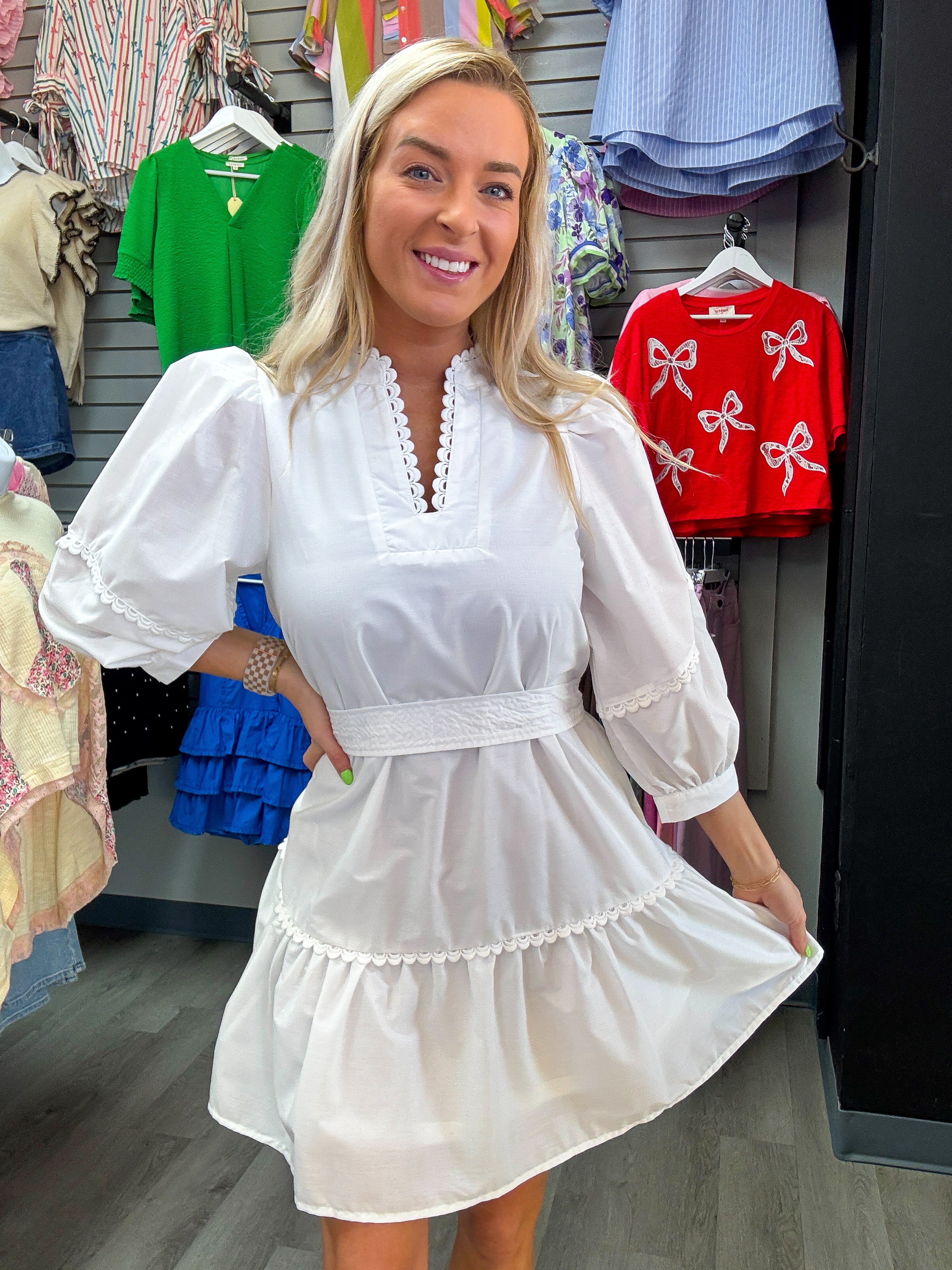 Solid v-neck ¾ sleeve mini dress featuring scallop trim. Removable belt at waist. Pockets at side. Lined. Woven. Non-sheer. Lightweight.